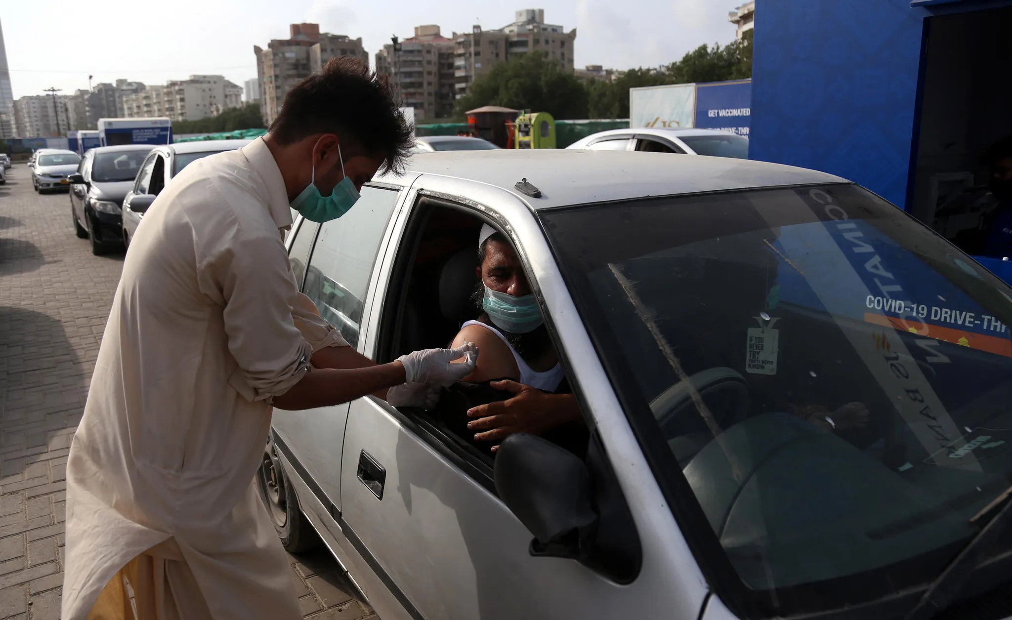 People line up with their cars to get vaccinated at the first drive-through COVID-19 vaccination facility in Karachi, Pakistan, 06 August 2021. Federal Planning Development and Special Initiatives Minister Asad Umar announced that the authorities aime to inoculate 70 million people by the end of 2021. (Photo by Rehan Khan/EPA/EFE)