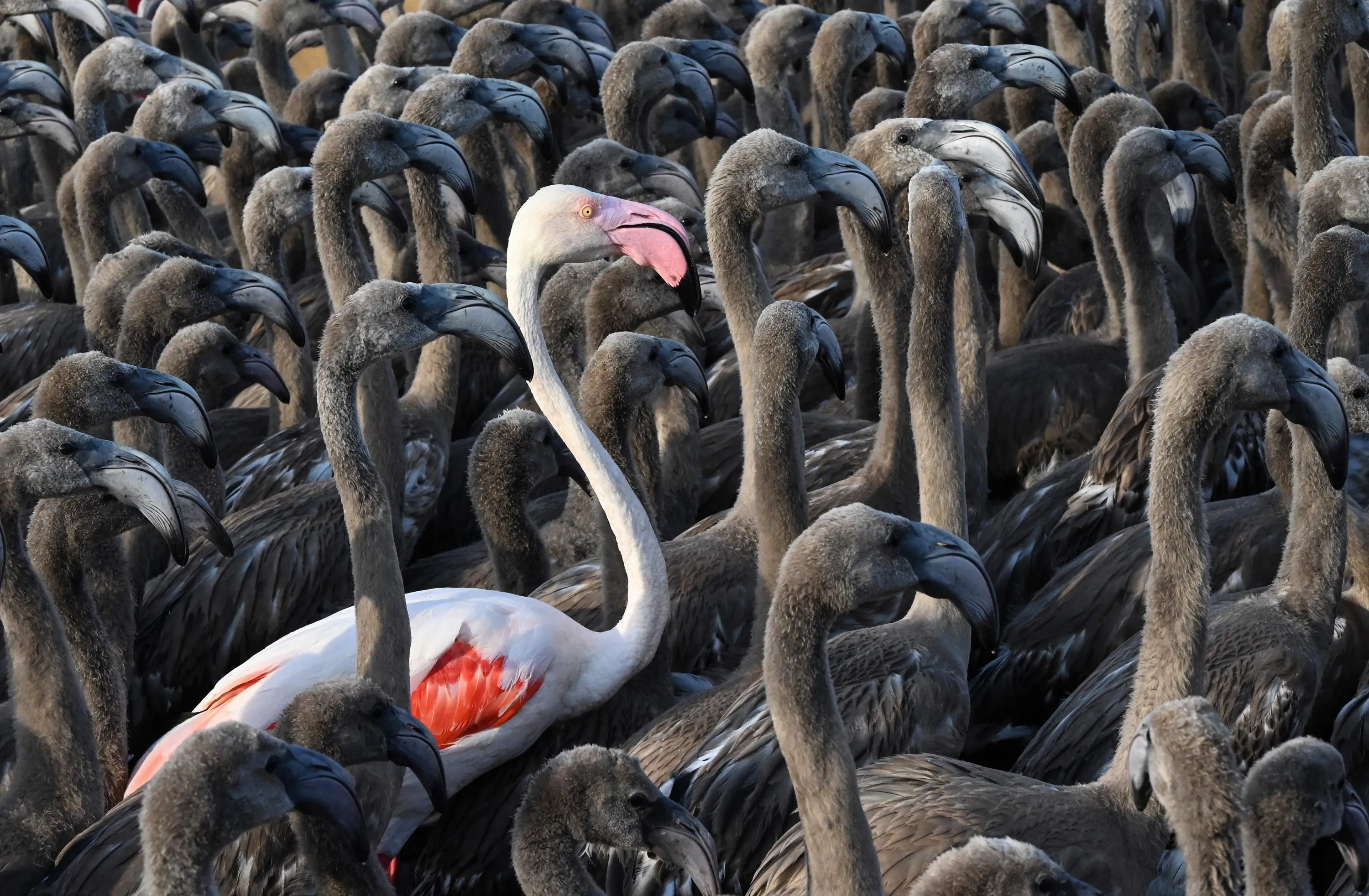 A pink flamingo stands among flamingos chicks in a pen in Aigues-Mortes, near Montpellier, southern France, on August 3, 2021, during the annual tagging and controling operation to monitor the evolution of the species. (Photo by Pascal Guyot/AFP Photo)