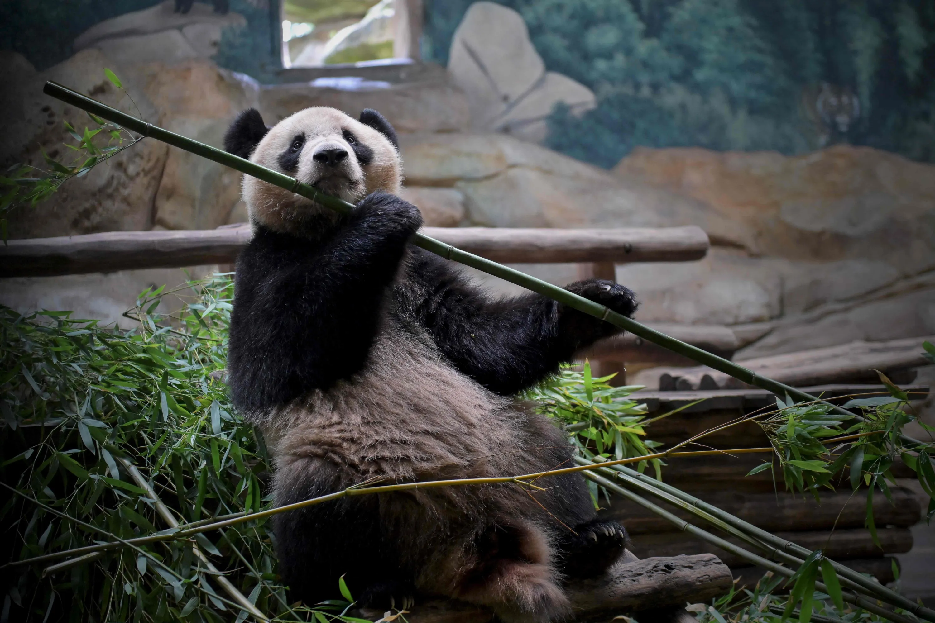 Yuan Meng, a young male panda eats bamboo as he sits in his enclosure at the Zoo-Parc de Beauval, in Saint-Aignan, central France, on July 23, 2021. (Photo by Guillaume Souvant/AFP Photo)