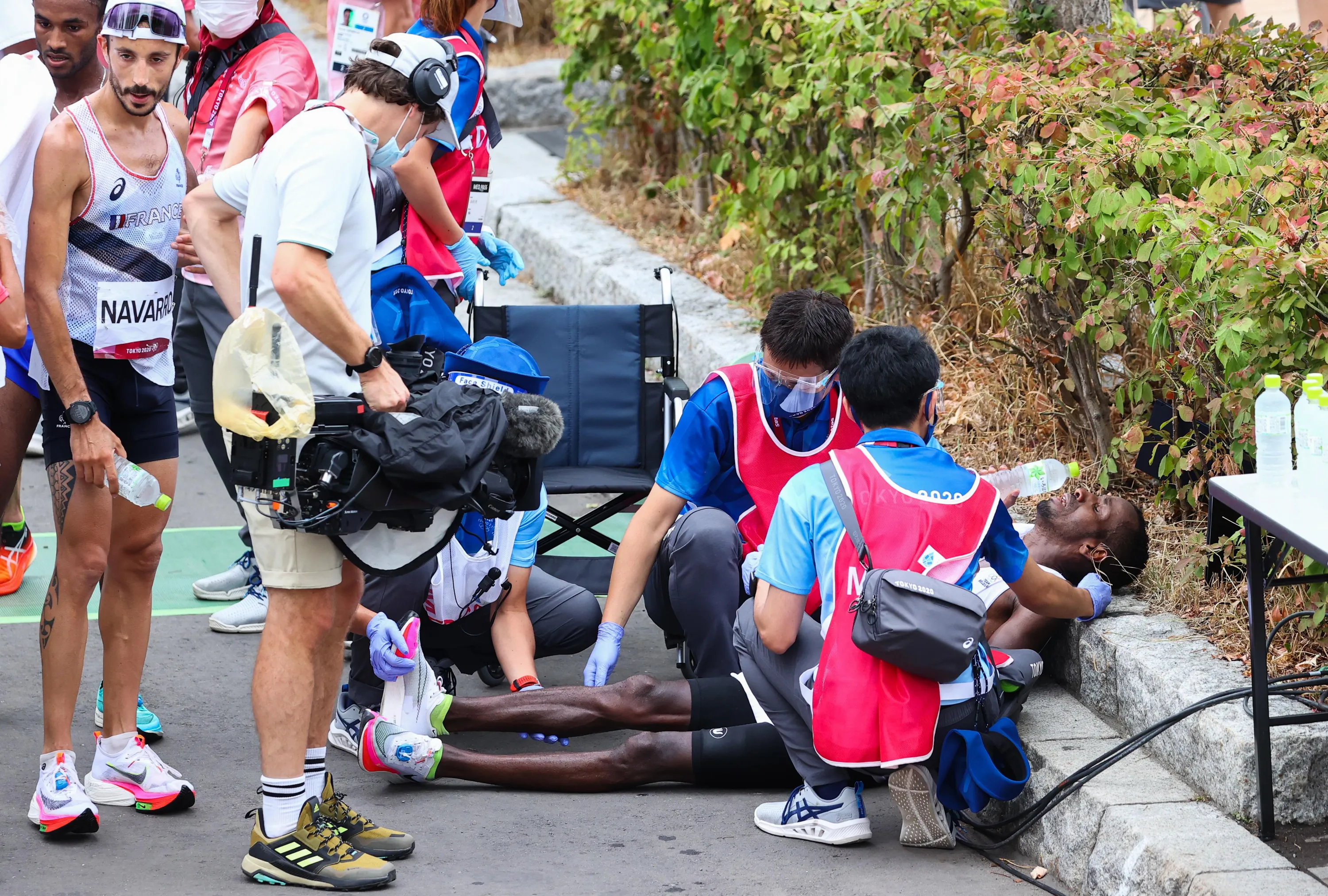 Third-placed Belgium's Bashir Abdi receives medical attention after competing in the men's marathon final during the Tokyo 2020 Olympic Games in Sapporo on August 8, 2021. (Photo by Feline Lim/Reuters)