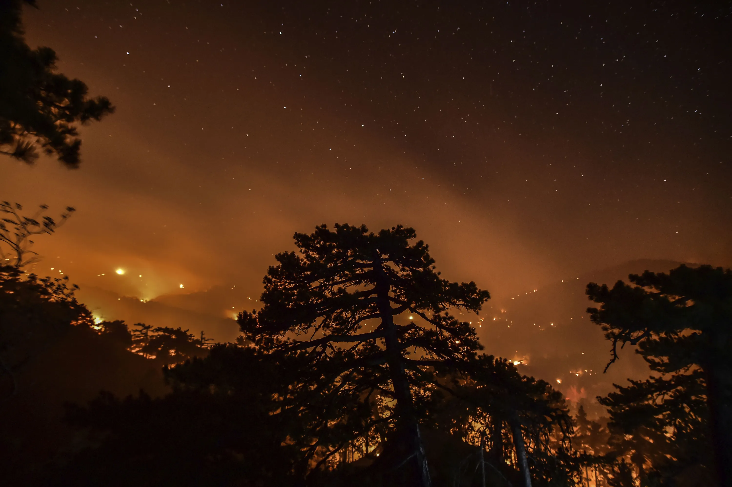A new fire rages the forest in Senyayla village near near tourist resort of Marmaris, Mugla, Turkey, Saturday, August 7, 2021. Turkey's wildfires have left little behind, turning green forests into ashen, barren hills. The destruction is intensely felt by Turkey's beekeepers, who have lost thousands of hives, the pine trees and the bugs their bees depend on, in a major blow to Turkey's honey industry. (Photo by Ismail Coskun/IHA via AP Photo)