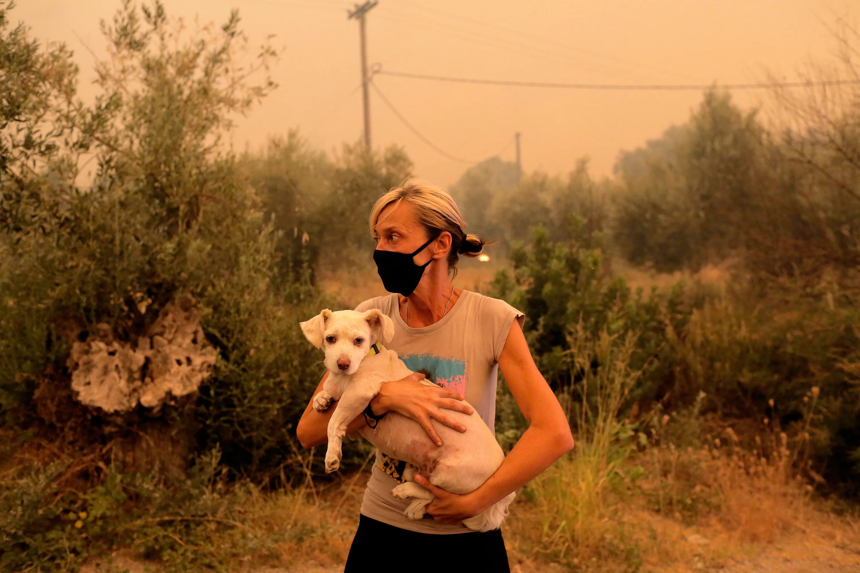 A local resident holds her dog that was rescued by locals during a wildfire at the village of Pefki in the Evia, Greece, 08 August 2021. Fires that broke out in Attica and Evia island this week have burned more than a quarter of a million stremmas, the National Observatory of Athens' center Beyond said on 08 August. Some 76,150 stremmas (7,615 hectares) have been burnt so far in northern Attica. At Evia island the surface area of burnt land is measured at 197,940 stremmas (19,794 hectares). These figures concern only the fires in Attica and Evia, but dozens of large fires have affected several areas across the country. (Photo by Kostas Tsironis/EPA/EFE)