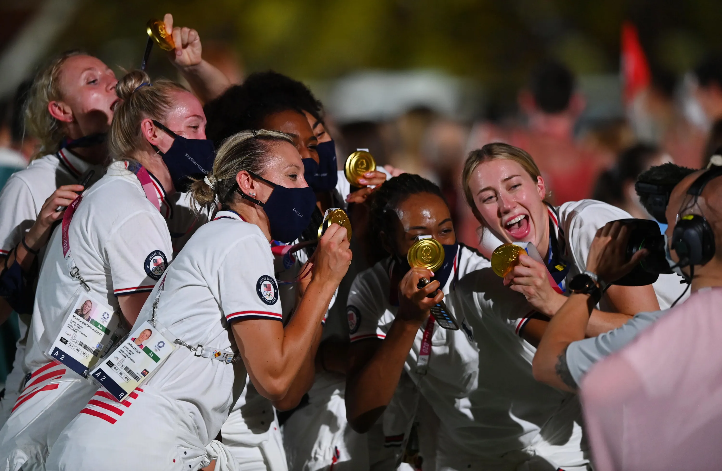 Unidentified athletes from the United States pose with their medals during the closing ceremony of the Tokyo 2020 Olympic Games, on August 8, 2021 at the Olympic Stadium in Tokyo. (Photo by Toby Melville/Reuters)