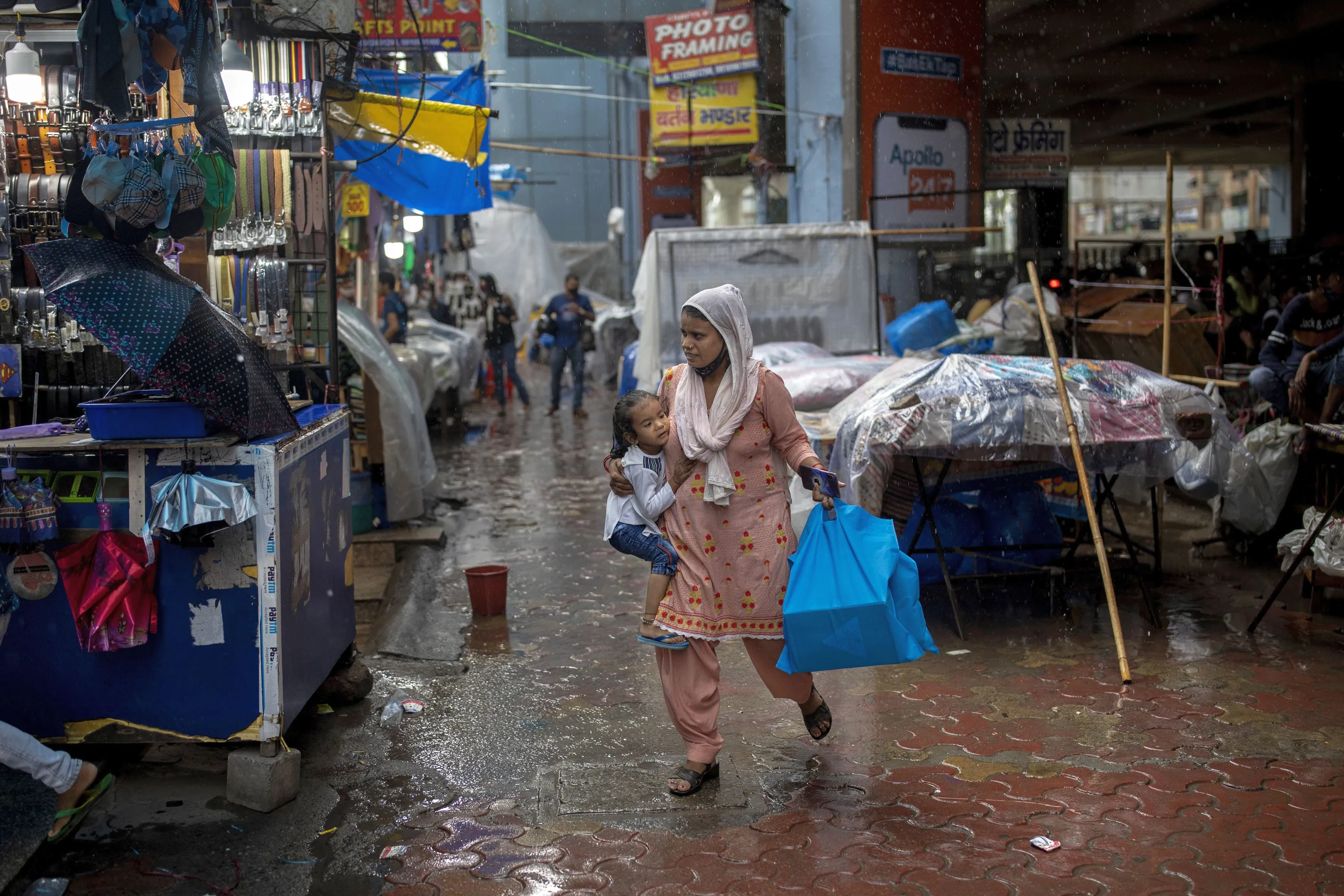 A woman carries a child as she hurriedly walks through a market during a downpour in Noida, a suburb of New Delhi, India, Friday, July 30, 2021. (Photo by Altaf Qadri/AP Photo)