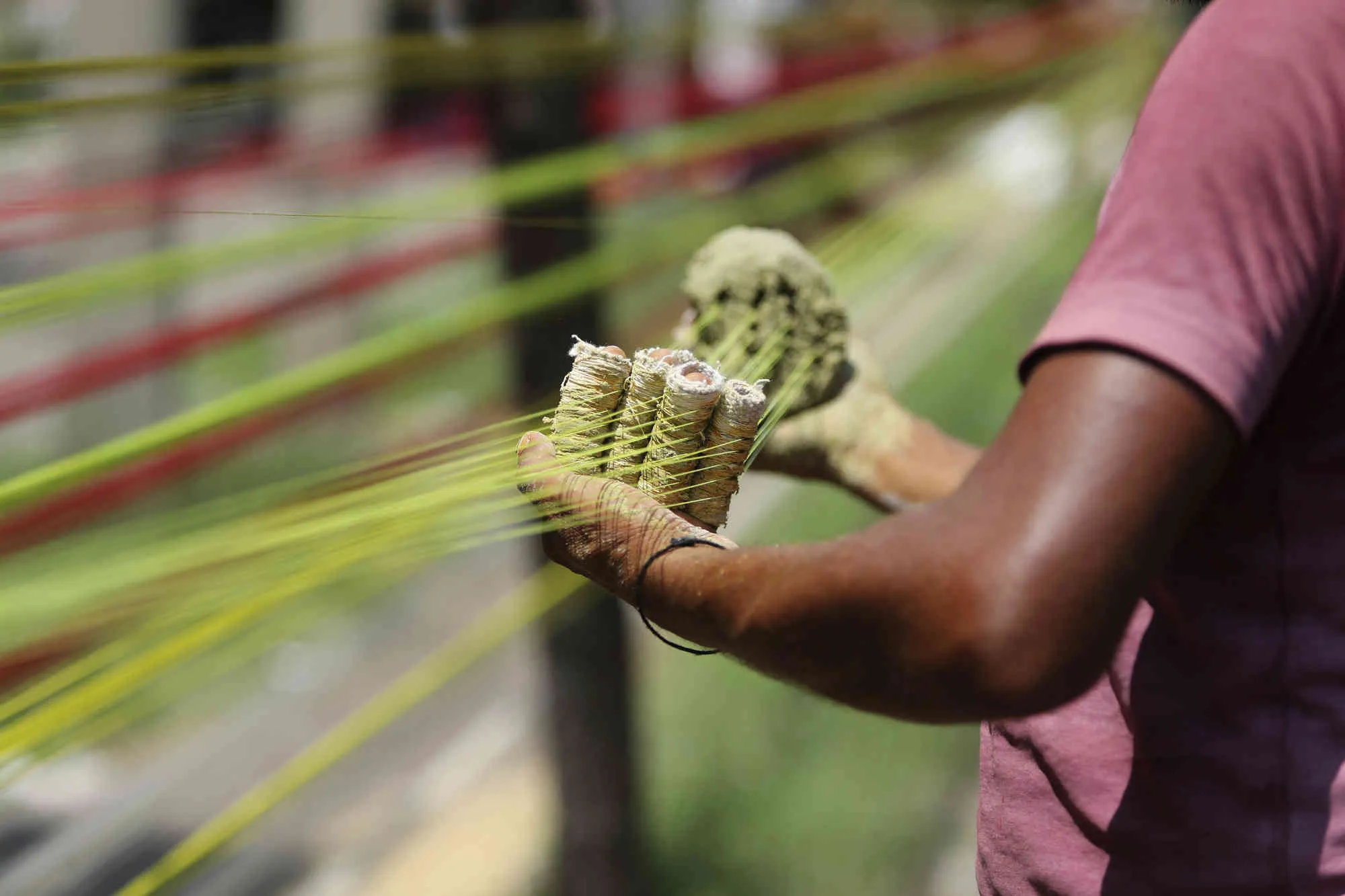 An Indian thread maker prepares colored threads for flying kites in Jammu, India, Tuesday, August 3, 2021. The demand for these threads goes up in August when people in northern India fly kites and peaks during Independence Day, which falls on August 15.. (Photo by Channi Anand/AP Photo)