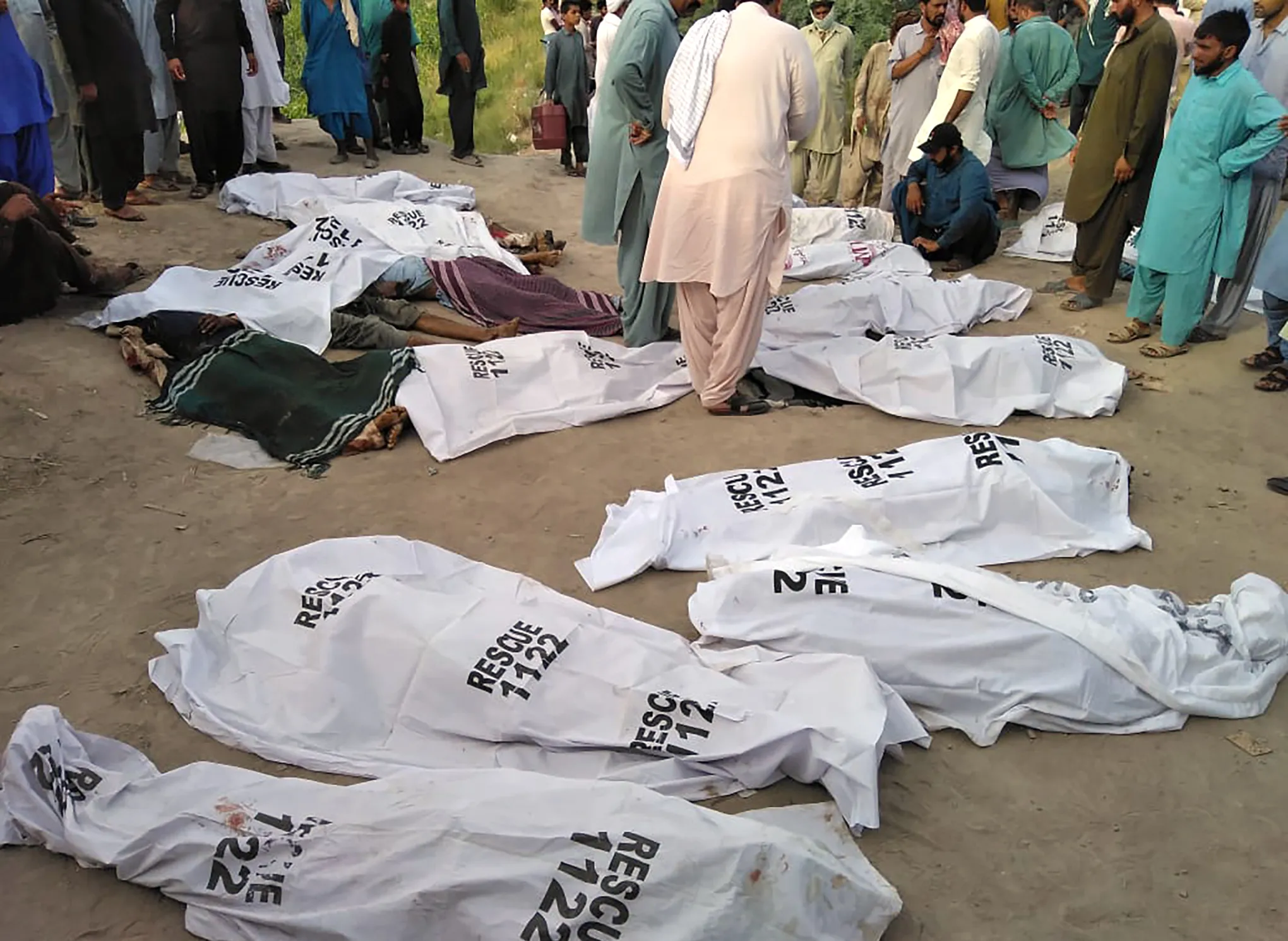 In this handout photo released by Punjab Province's Emergency Service Rescue 11222, shows people gathering around covered bodies close to the site of a deadly bus accident near Dera Ghazi Khan, Pakistan, Monday, July 19, 2021. (Photo by Emergency Service Rescue 1122 via AP Photo)