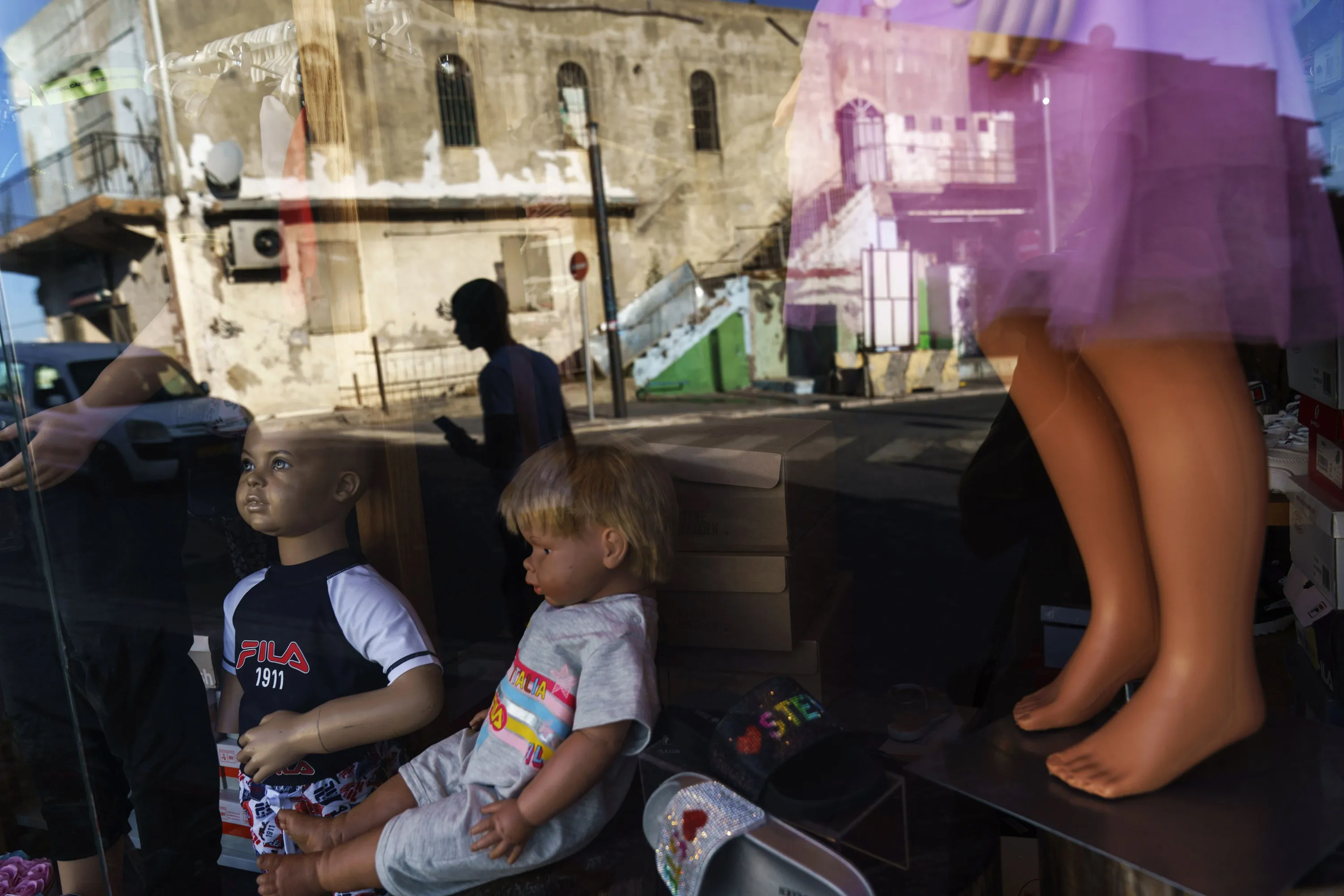 A pedestrian walks past child mannequins in a store window in the mixed Arab-Jewish town of Lod, central Israel, Wednesday, May 26, 2021, days after a cease-fire was reached in the 11-day war between Gaza's Hamas rulers and Israel. (Photo by David Goldman/AP Photo)