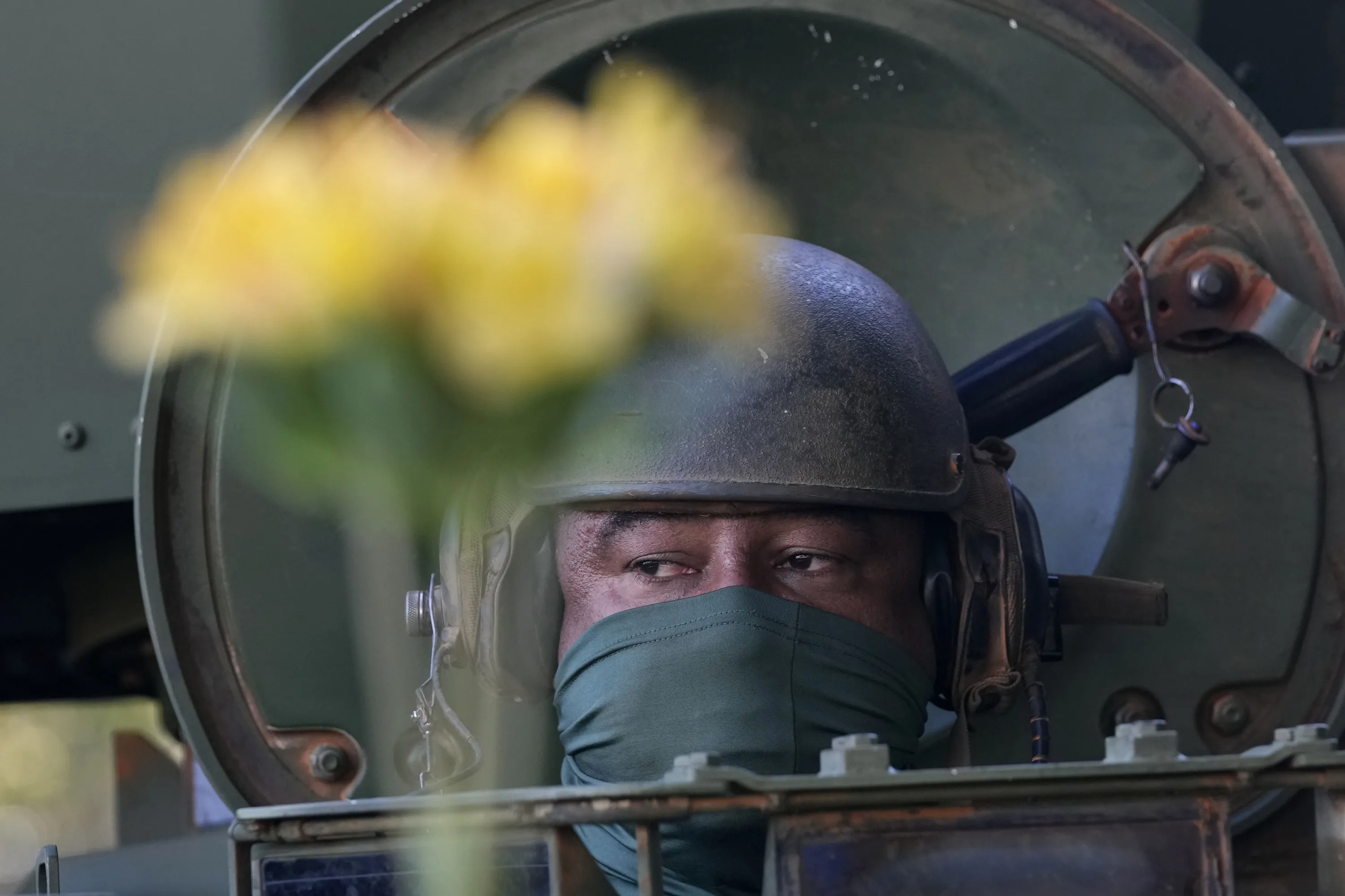 A soldier in a parked military vehicle is offered yellow flowers by opposition protesters outside Navy headquarters in Brasilia, Brazil, Tuesday, August 10, 2021, after parading by the Planalto presidential palace. A military convoy paraded by the palace on Tuesday, the day of a key congressional vote on a constitutional reform proposal supported by President Jair Bolsonaro that would add printed receipts to some of the nation’s electronic ballot boxes. (Photo by Eraldo Peres/AP Photo)