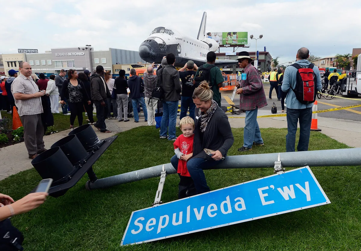 One of hundreds of street signs temporarily removed for the 12-mile road trip of space shuttle Endeavour is used as prop as a family gets their picture taken with the orbiter parked in a mall parking lot in Los Angeles, California. (Photo by Kevork Djansezian)