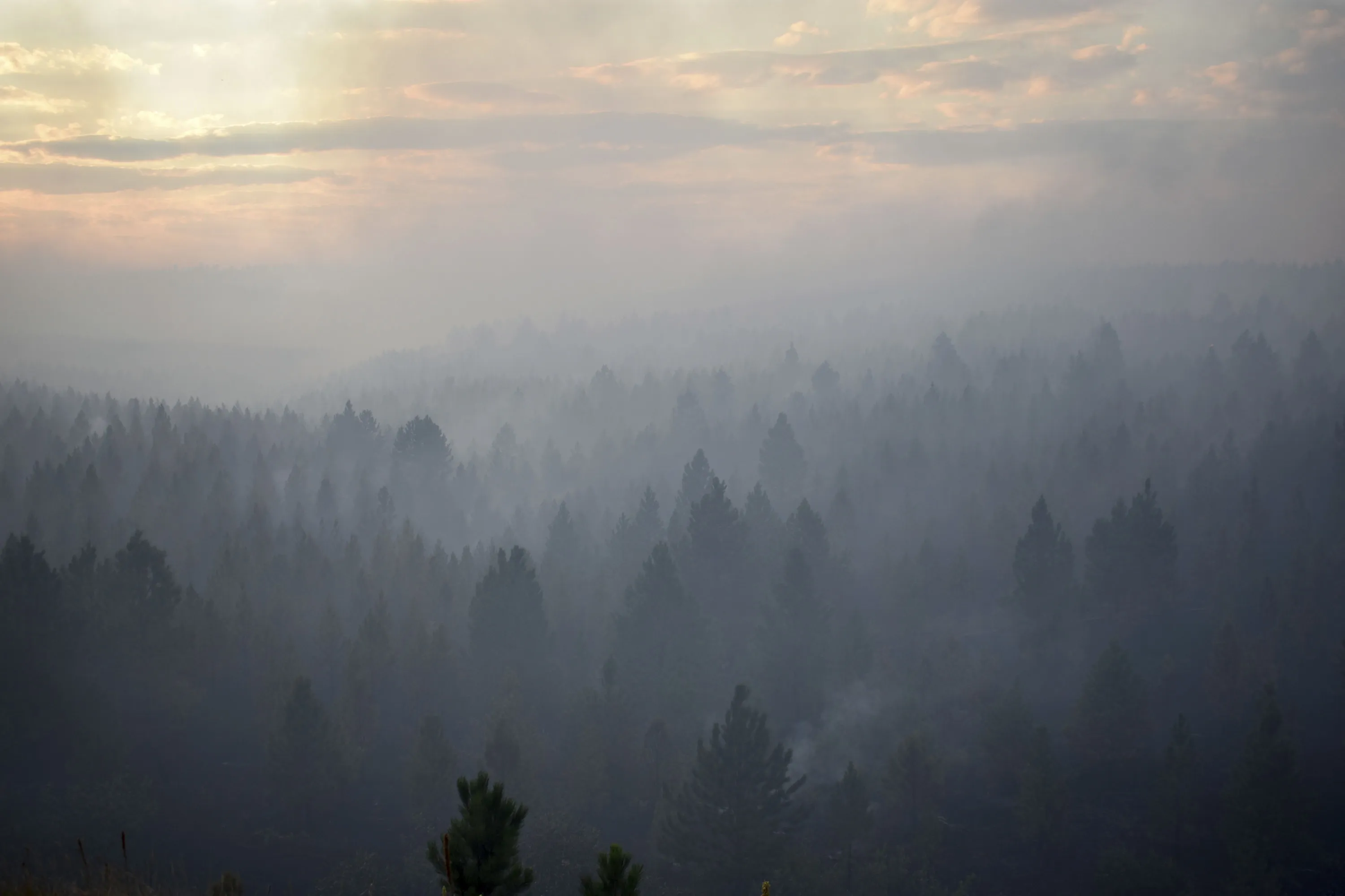 Smoke from a wildfire obscures a stand of trees on the Northern Cheyenne Indian Reservation, Wednesday, August 11, 2021, near Ashland, Mont. In southeastern Montana, communities in and around the Northern Cheyenne Indian Reservation were ordered to evacuate as the Richard Spring Fire grew amid erratic winds. (Photo by Matthew Brown/AP Photo)