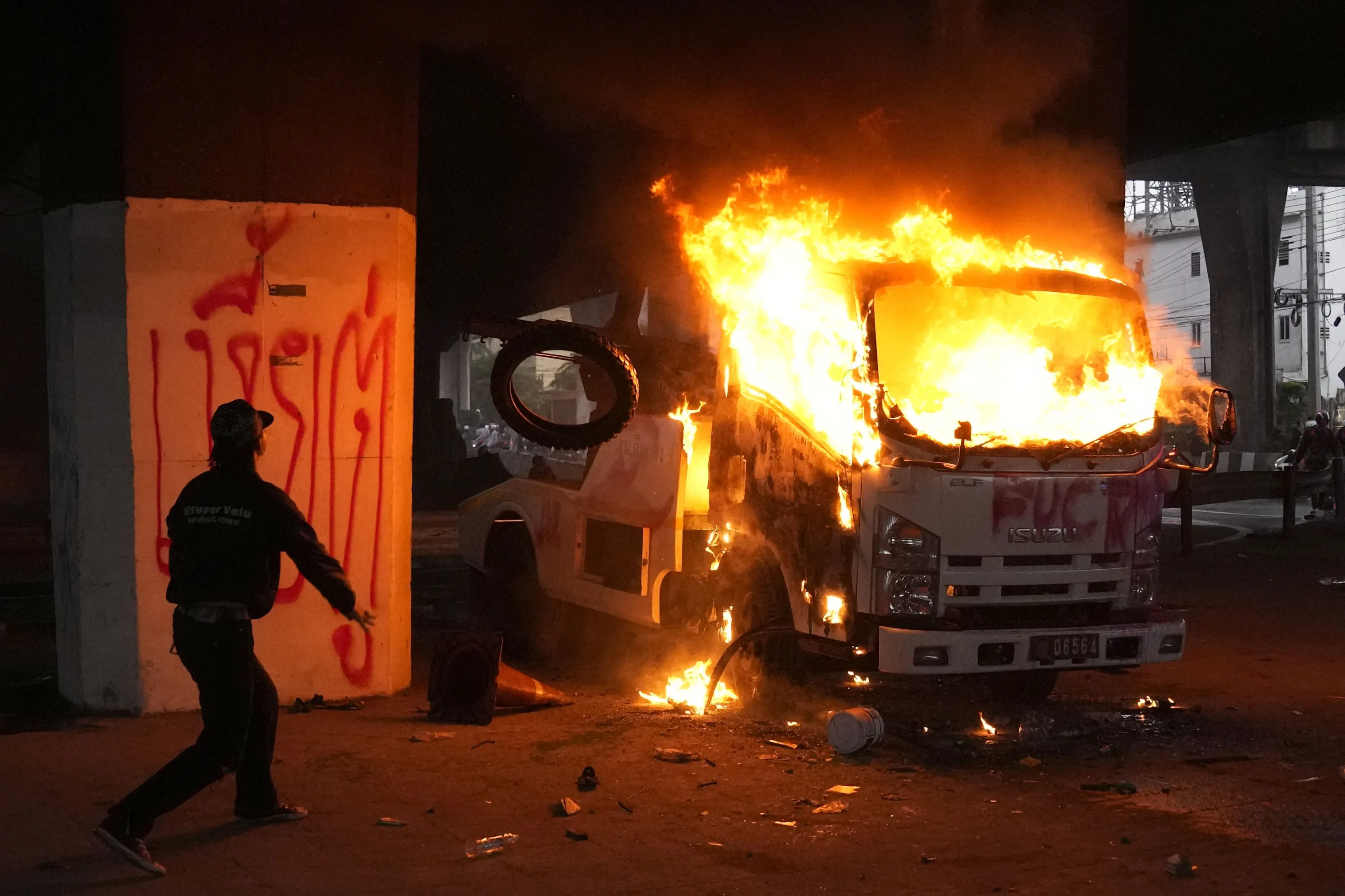 Anti-government protester throw tires into a burning police truck during protest in Bangkok, Thailand, Wednesday, August 11, 2021. (Photo by Sakchai Lalit/AP Photo)