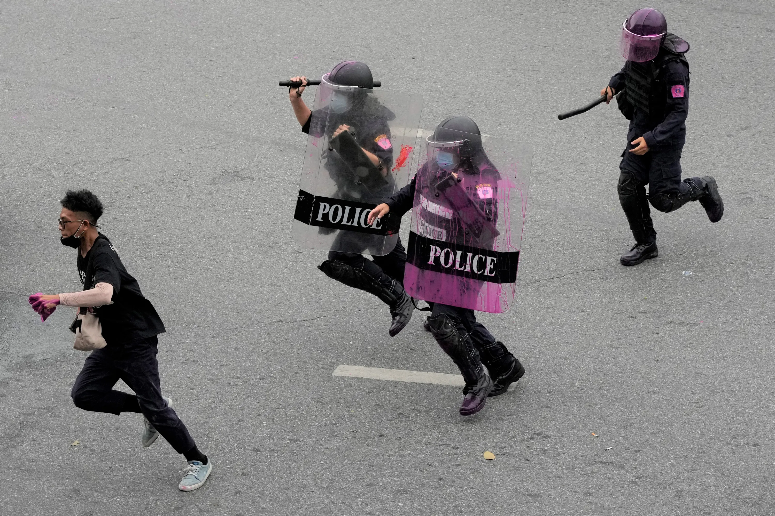 Riot police chase an anti-government protester during protest in Bangkok, Thailand, Wednesday, August 11, 2021. (Photo by Sakchai Lalit/AP Photo)
