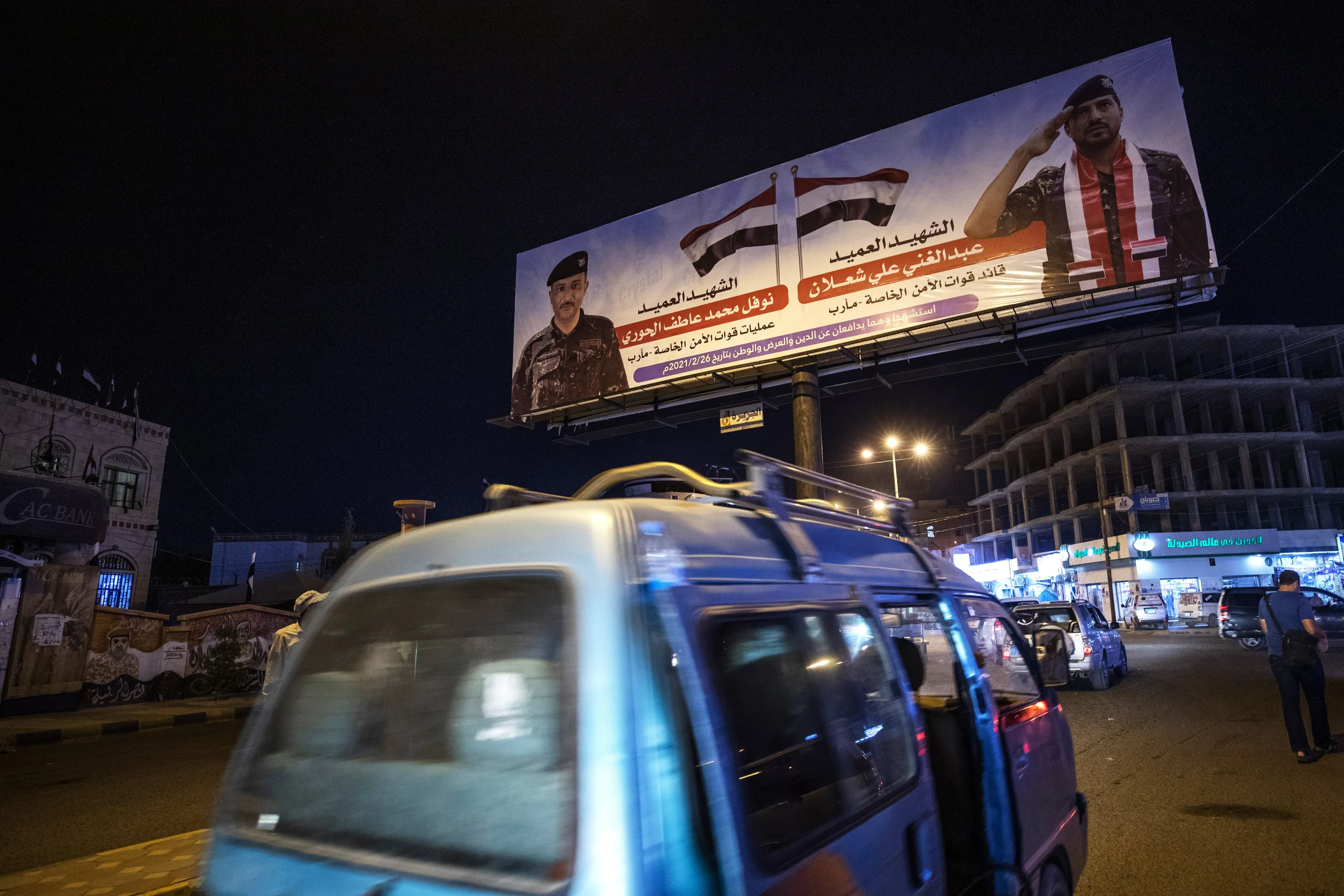 Banners show Yemeni fighters who were killed in clashes with Houthi rebels, on a street in Marib, Yemen, Sunday, June 20, 2021. (Photo by Nariman El-Mofty/AP Photo)