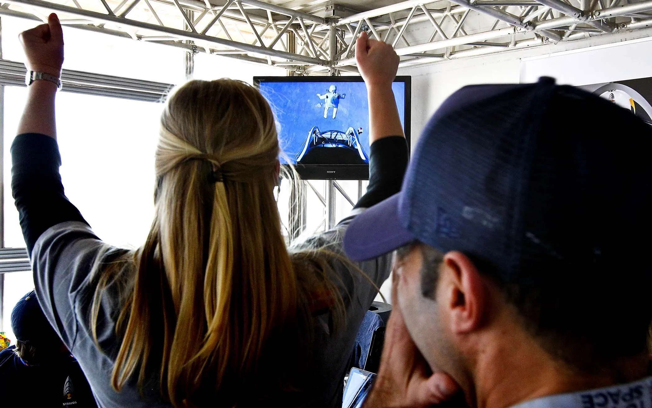 Project team members cheer as Baumgartner leaps out of the space capsule. (Photo by Ross D. Franklin/Associated Press)