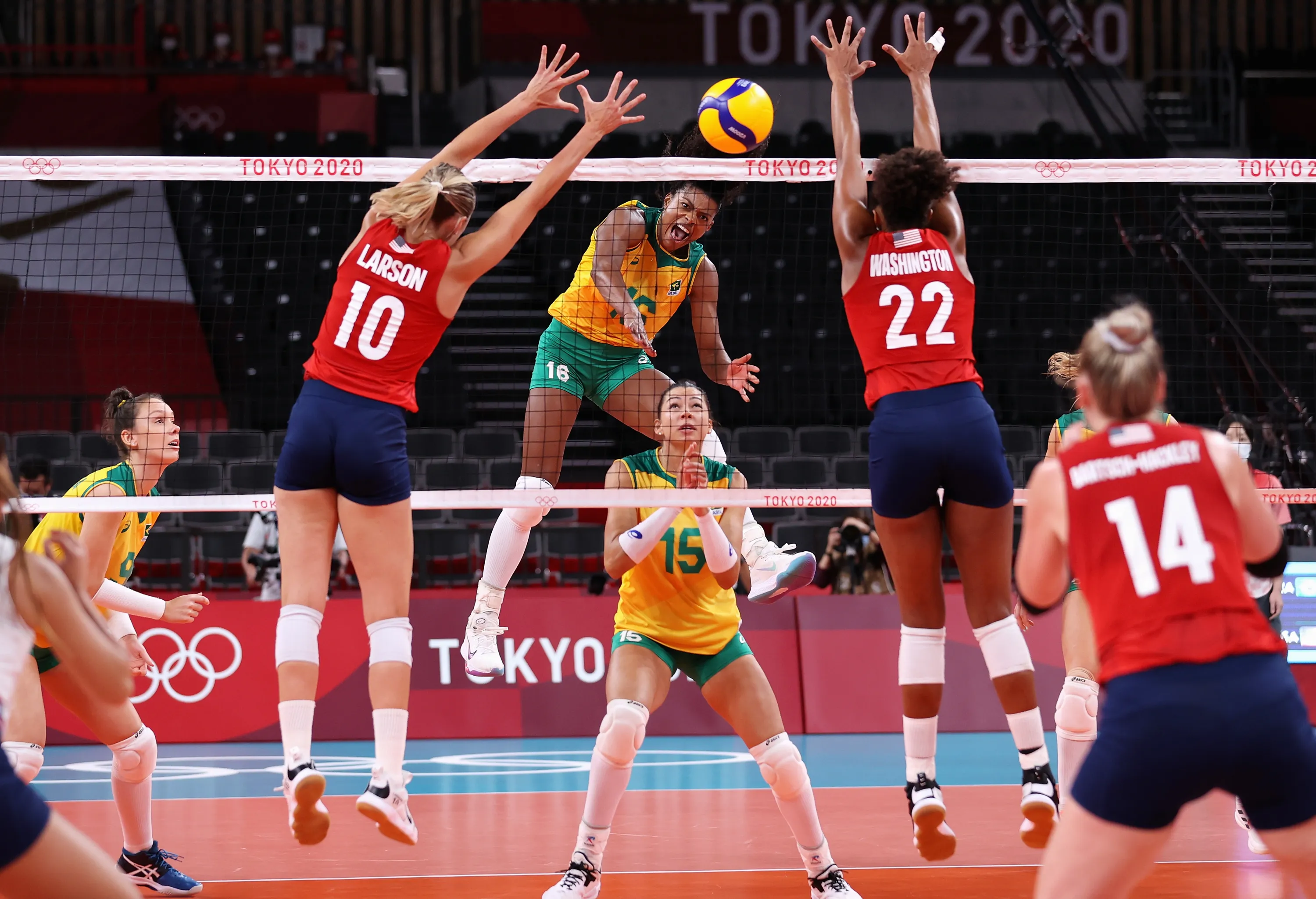 Fernanda Rodrigues #16 of Team Brazil competes against Jordan Larson #10 and Haleigh Washington #22 of Team United States during the Women's Gold Medal Match on day sixteen of the Tokyo 2020 Olympic Games at Ariake Arena on August 08, 2021 in Tokyo, Japan. (Photo by Toru Hanai/Getty Images)