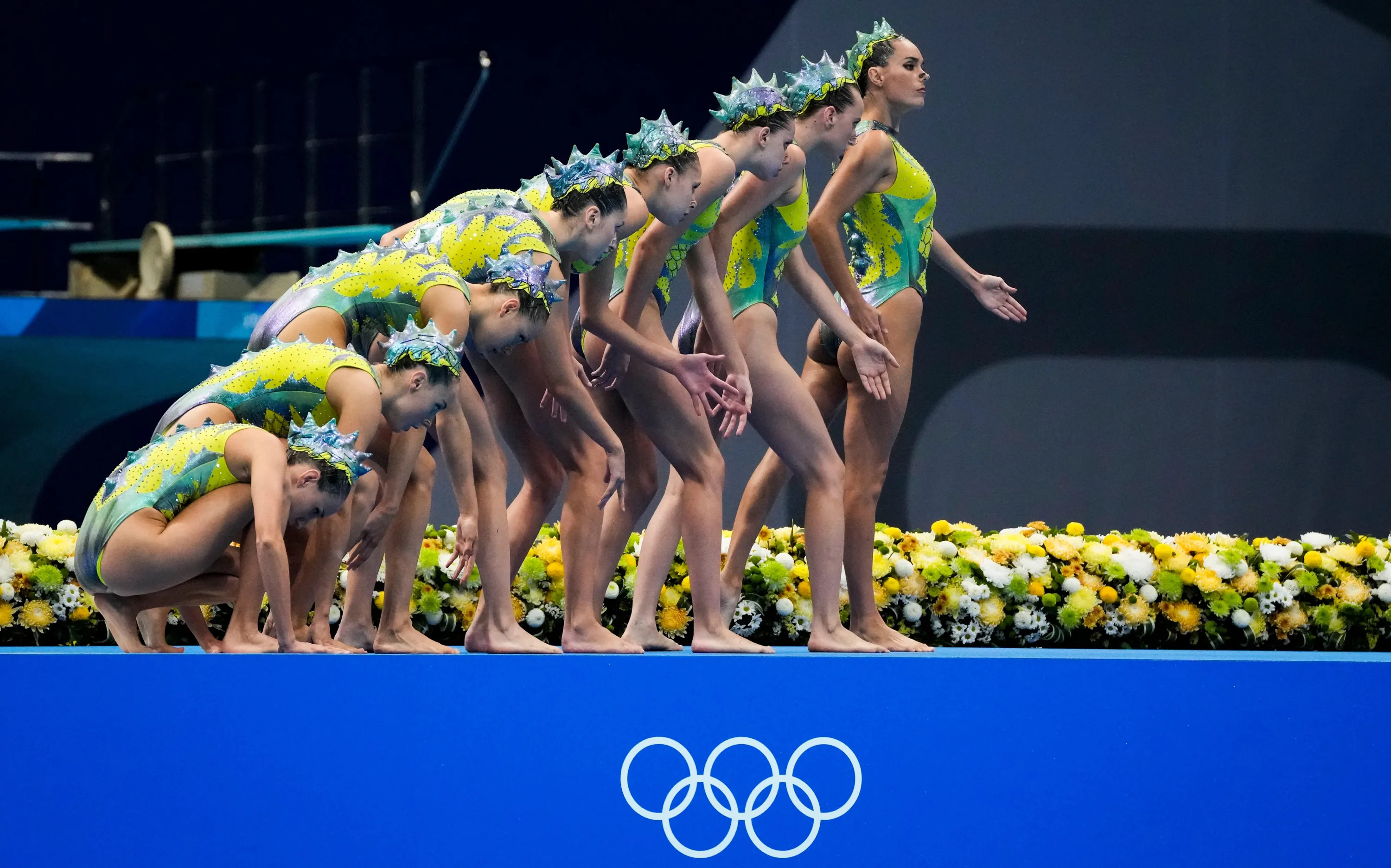 Spain's team compete in artistic swimming team, free routine at the 2020 Summer Olympics, Saturday, August 7, 2021, in Tokyo, Japan. (Photo by Dmitri Lovetsky/AP Photo)
