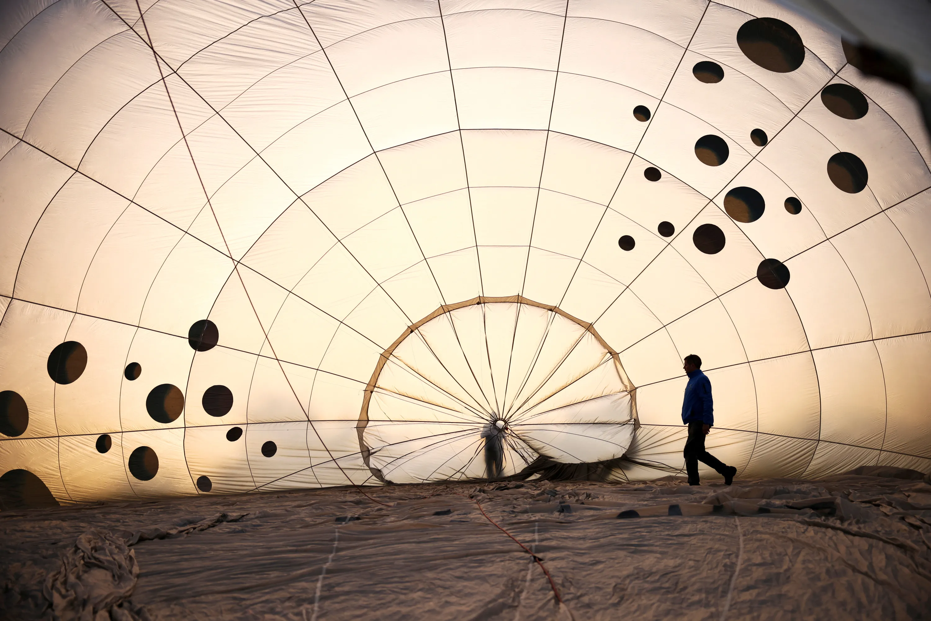 A crew member inspects a partially inflated hot air balloon at the Bristol International Balloon Fiesta in Bristol, Britain, August 4, 202. (Photo by Henry Nicholls/Reuters)