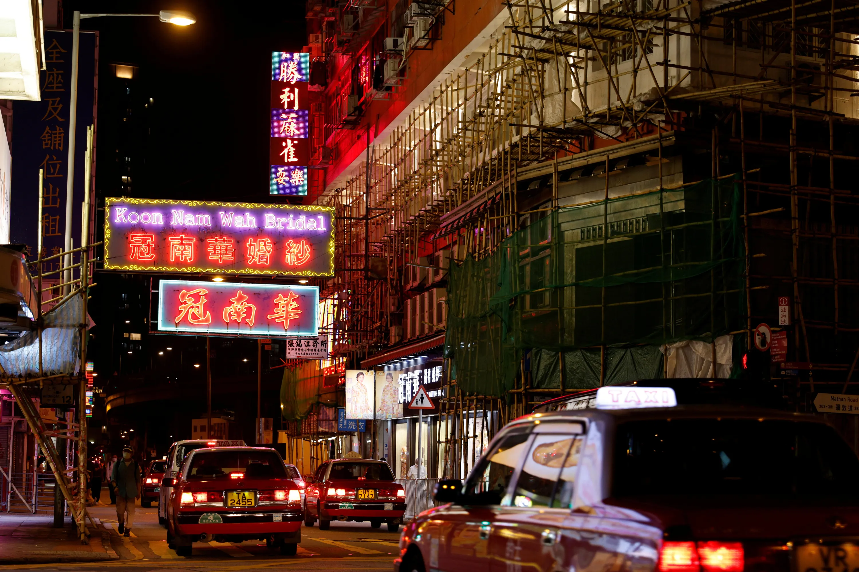 Taxis drive under neon and LED signs at Yau Ma Tei, in Hong Kong, China on August 8, 2021. (Photo by Tyrone Siu/Reuters)