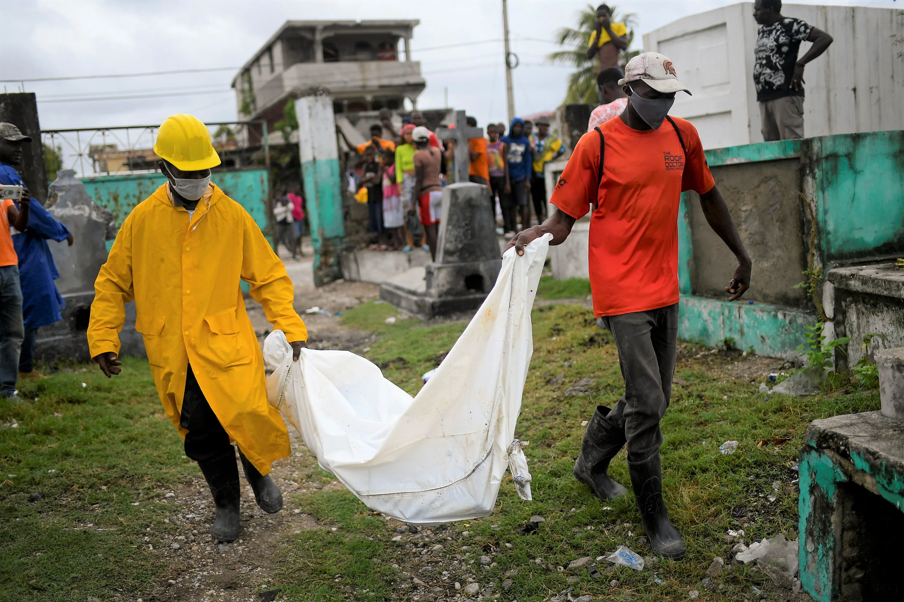 Men carry the body of a boy, who was found in a collapsed building, into the cemetery in Les Cayes, Haiti, Tuesday, August 17, 2021, three days after a 7.2 magnitude earthquake hit. According to an engineer working for Les Cayes Mayor, the boy's body was found Monday amid the rubble of a collapsed hostal. (Photo by Matias Delacroix/AP Photo)