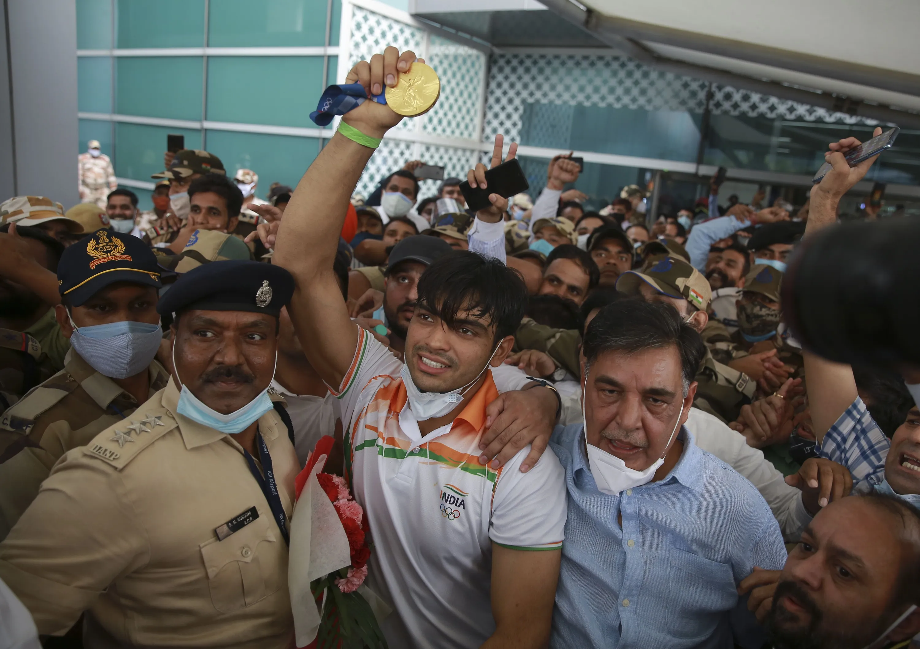 Olympic medallist Neeraj Chopra displays the gold medal he won in the men’s javelin at the Tokyo Games as he arrives for a rousing reception at the Indira Gandhi International Airport in New Delhi, India, Monday, August 9, 2021. (Photo by AP Photo/Stringer)