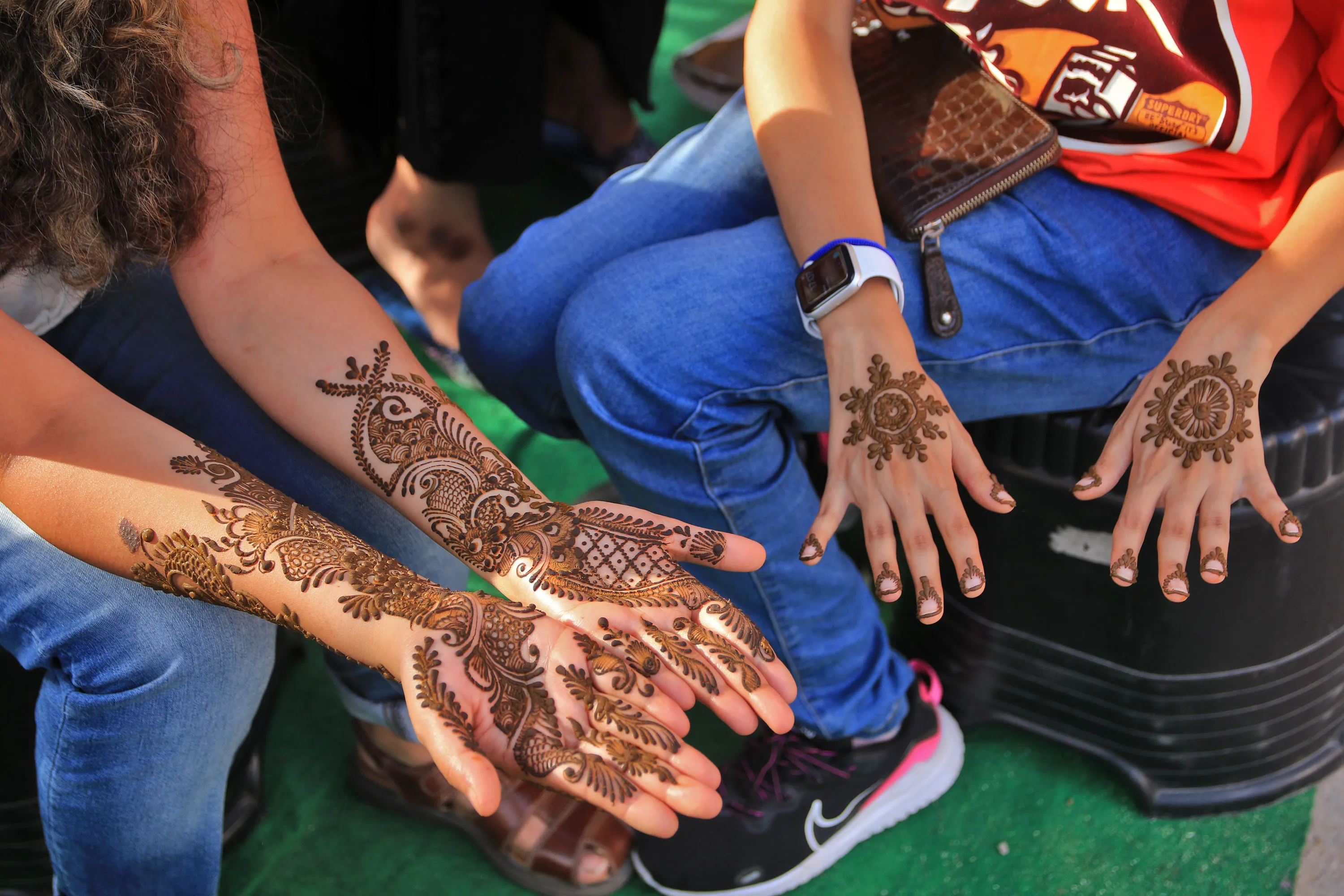 Women applying “Henna” on their hands on the occasion of “Sinjara” festival, ahead of Teej, in Jaipur, Rajasthan, India, on August 10, 2021. (Photo by Vishal Bhatnagar/NurPhoto/Rex Features/Shutterstock)