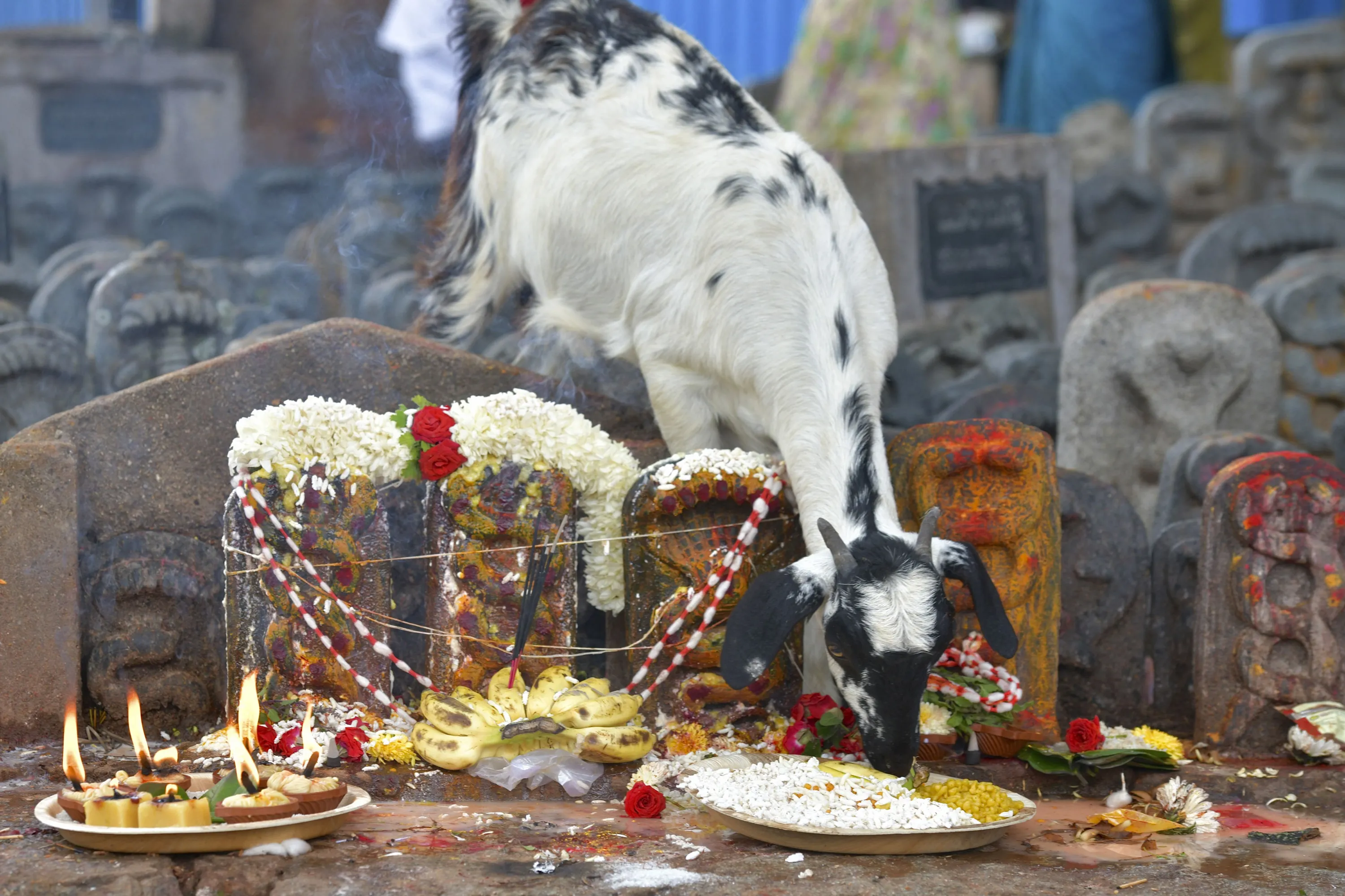 A goat eats from offerings made by Hindu devotees to stone sculptures of snakes on the occasion of “Naga Panchami”, an auspicious day in the Hindu calendar in which serpents are worshipped, in the suburbs of Bangalore on August 13, 2021. (Photo by Manjunath Kiran/AFP Photo)