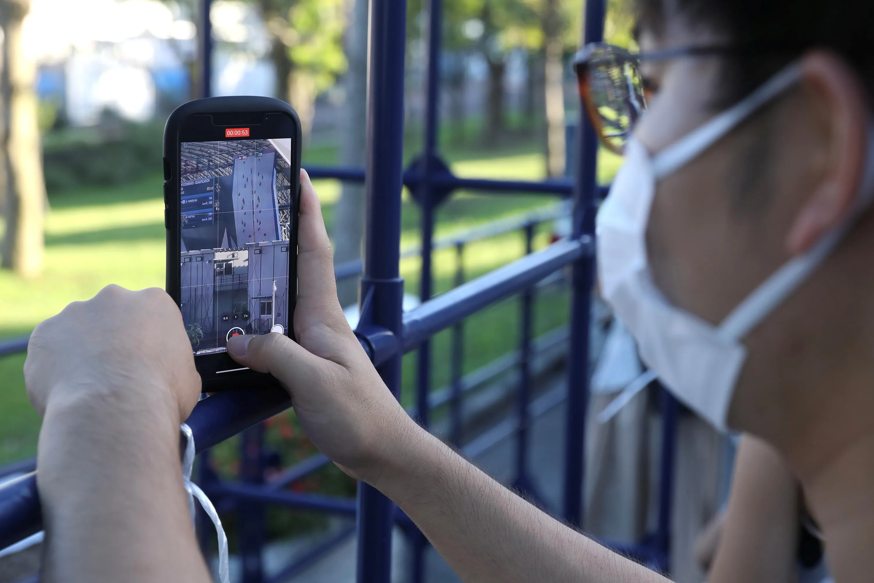 A man films the the Sports Climbing venue from a public walkway at Aomi Urban Sports Park at the Tokyo 2020 Olympic Games, in Tokyo, Japan on August 3, 2021. (Photo by Kevin Coombs/Reuters)
