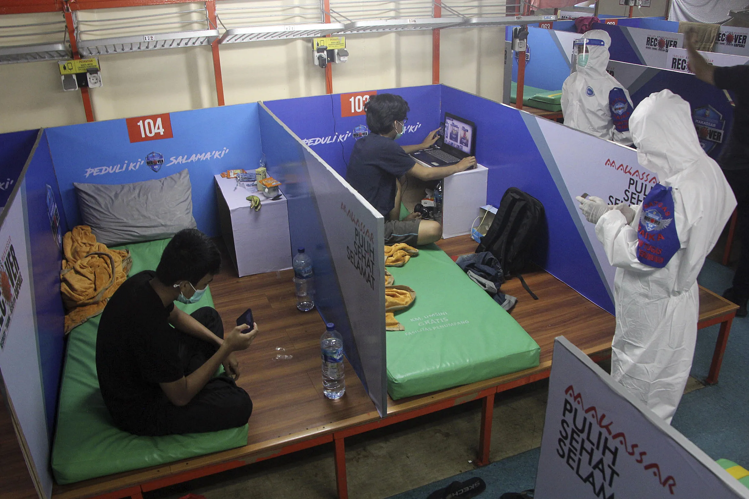 Health workers in protective suits check COVID-19 patients in their cubicles on board of KM Umsini, a passenger ship turned into an isolation center for those with mild symptoms, at Soekarno-Hatta Port in Makassar, South Sulawesi, Indonesia, Sunday, August 8, 2021. Indonesia has the most confirmed daily cases of coronavirus in Asia as infections and deaths have surged over the past month and India's massive outbreak has waned. (Photo by Masyudi Syachban Firmansyah/AP Photo)