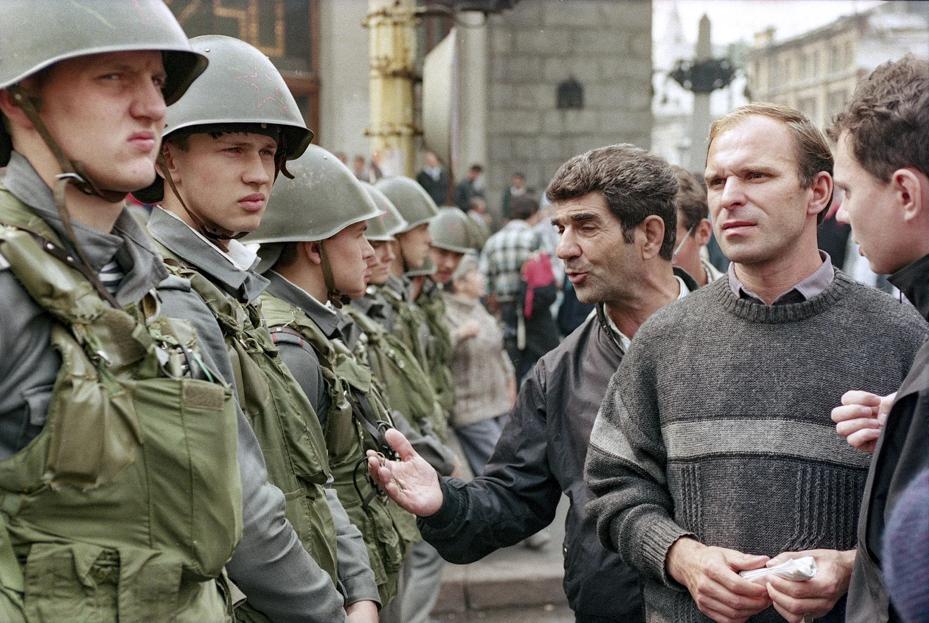 In this Tuesday, August 20, 1991 file photo, Muscovites debate with soldiers who guard the Manezh Square at Gorky Street in downtown Moscow during the coup attempt by hard-line Communists against the Soviet president, Russia. (Photo by Boris Yurchenko/AP Photo/File)