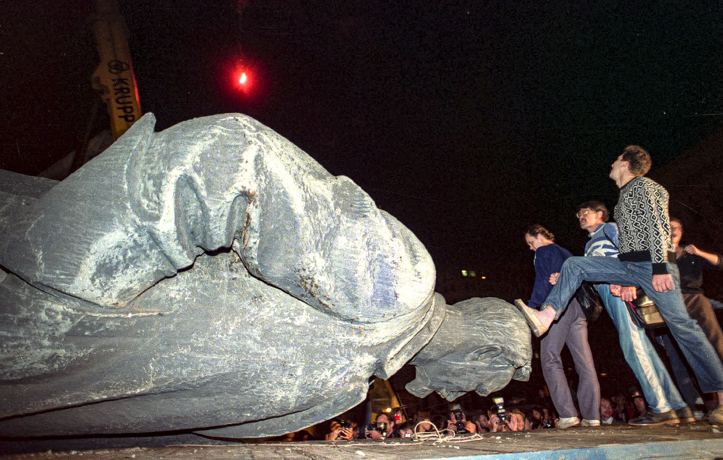 In this Friday, August 23, 1991 file photo, people kick the head of the statue of Felix Dzerzhinsky, the founder of the Soviet secret police, in front of the KGB main headquarters on the Lubyanka Square. (Photo by Alexander Zemlianichenko/AP Photo/File)