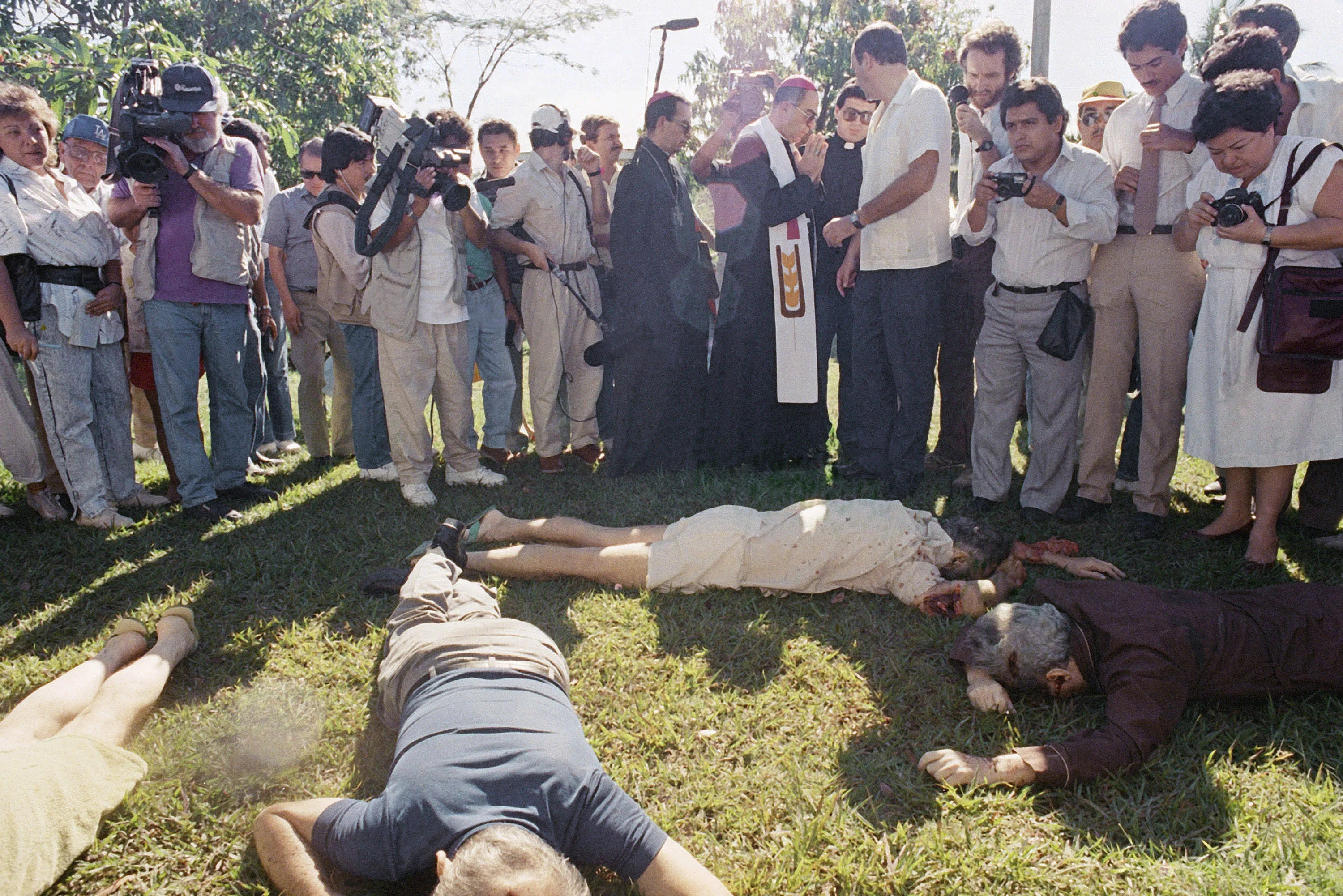 In this November 16, 1989, file photo, the Archbishop of San Salvador, Mons. Arturo Rivera y Damas and journalists view the bodies of six Jesuit priests murdered in San Salvador. The sentencing of former Salvadoran colonel Inocente Orlando Montano to 133 years in prison by a Spanish court on Friday, Sept. 11, 2020, in relation to the 1989 massacre by an elite comando unit is raising calls once again for El Salvador to investigate and prosecute the masterminds of the massacre. (Photo by John Hopper/AP Photo/File)