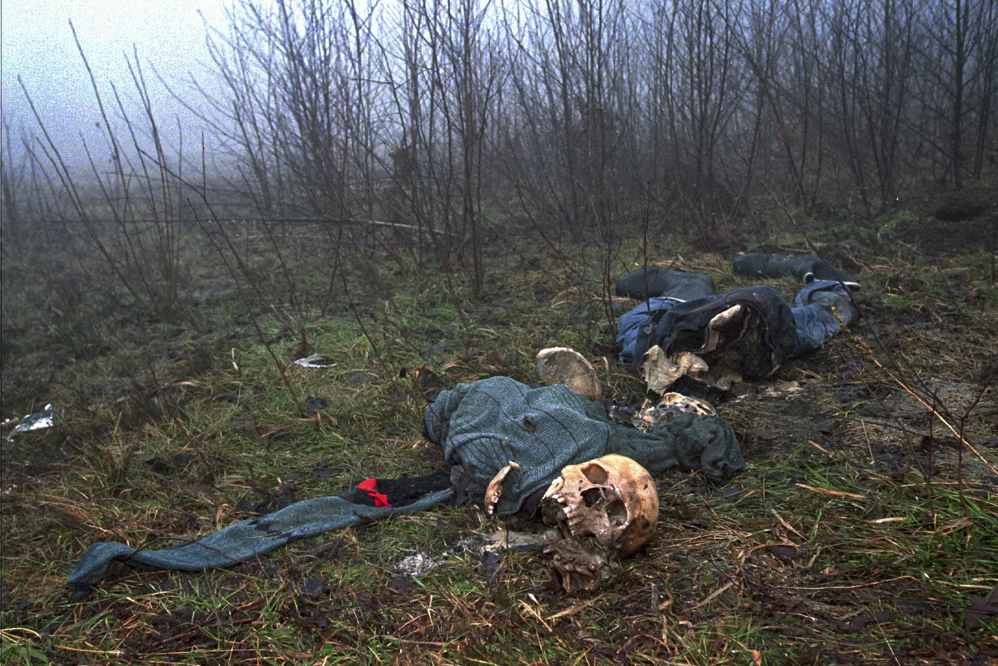 In this February 4, 1996, file photo one of four clothed skeletons being examined by U.N. investigator Elizabeth Rehn as she tries identify an estimated 8,000 Muslim men missing after the Serb conquest of the former Muslim enclave of Srebrenica in July 1995, lies on a hilltop. Twenty-six years after the July 1995 Srebrenica massacre, the only episode of Bosnia’s 1992-95 war to be legally defined as genocide, its survivors continue to grapple with the horrors they endured while also confronting increasingly aggressive downplaying and even denial of their ordeal. (Photo by Alexander Zemlianichenko/AP Photo/File)