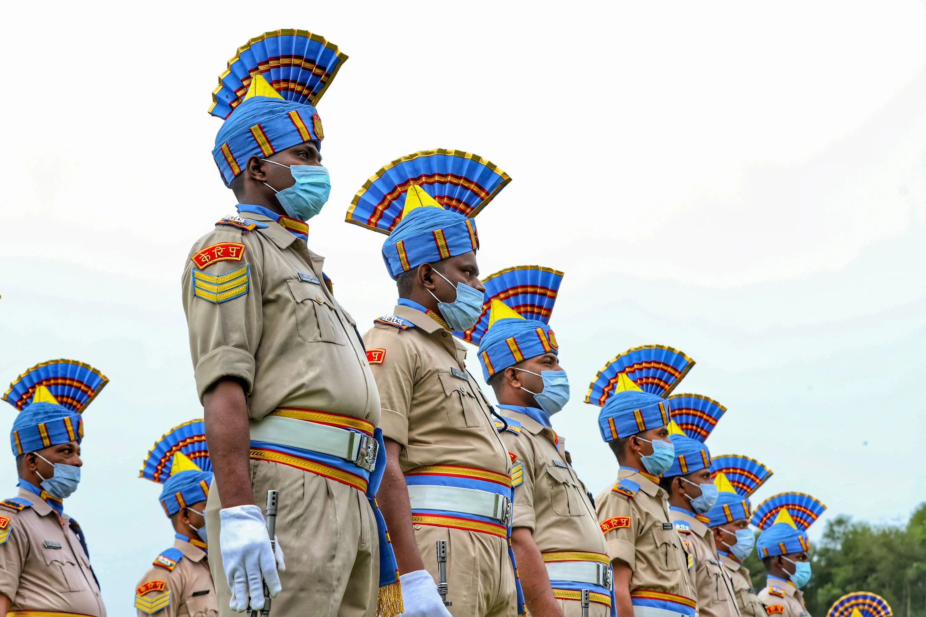 A Contigent of Indian Policemen stand in formation at Khushal Stadium where the authorities of Sopore held main function during India's 75th Independence Day Celebrations in Sopore District Baramulla Jammu and Kashmir India on 15 August 2021. (Photo by Nasir Kachroo/NurPhoto/Rex Features/Shutterstock)