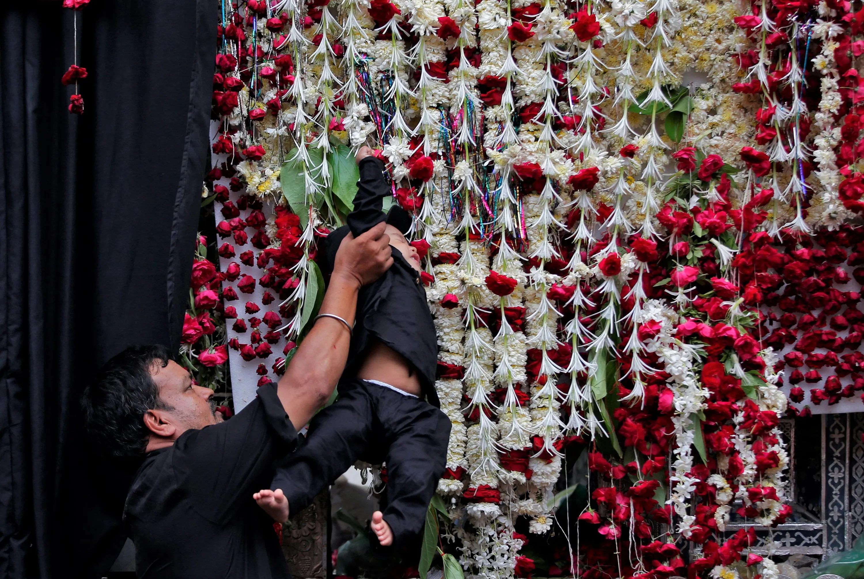 A Shi'ite Muslim holds a child to touch “Taziya”, a replica of the shrine of Imam Hussein, for blessing during a Muharram procession marking Ashura in Ahmedabad, India, August 20, 2021. (Photo by Amit Dave/Reuters)
