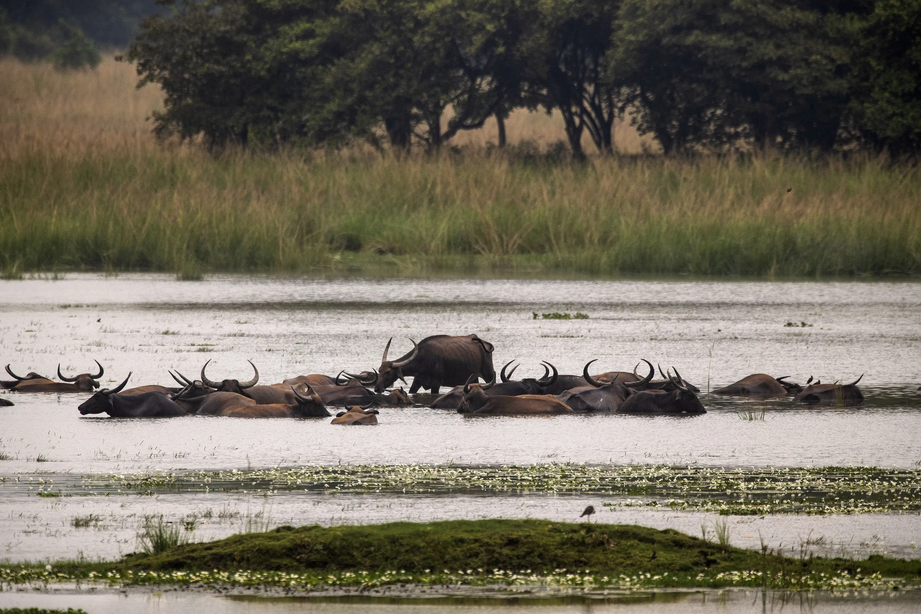 Wild buffalo cool off at the Pobitora wildlife sanctuary on the outskirts of Gauhati, India on August 16, 2021. (Photo by Anupam Nath/AP Photo)