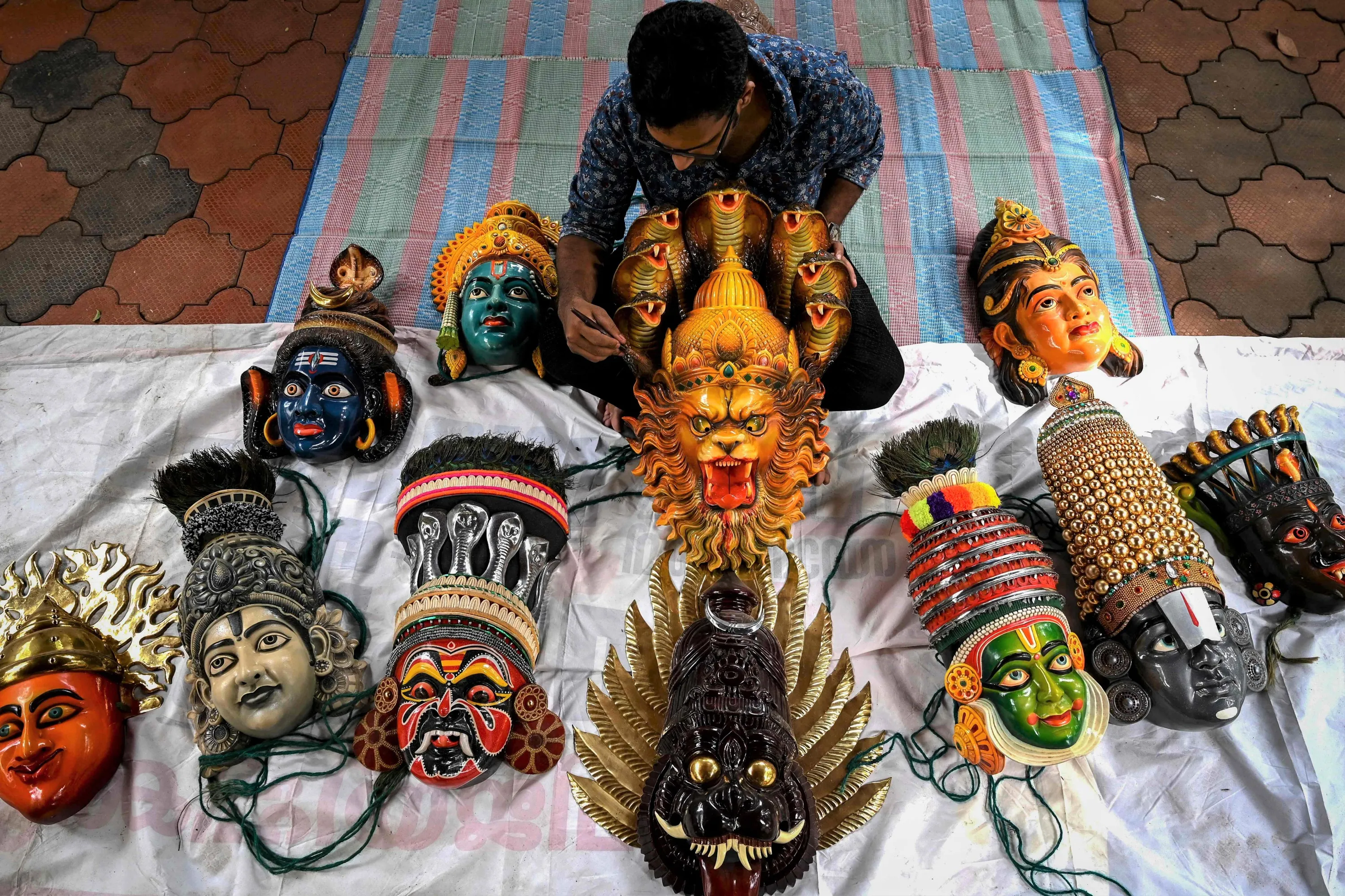 An artisan prepares face masks resembling various Hindu deities for Kummattikali which is a form of colourful mask dance as a part of Onam festival celebrations in Kerala on August 18, 2021. (Photo by Arun Sankar/AFP Photo)