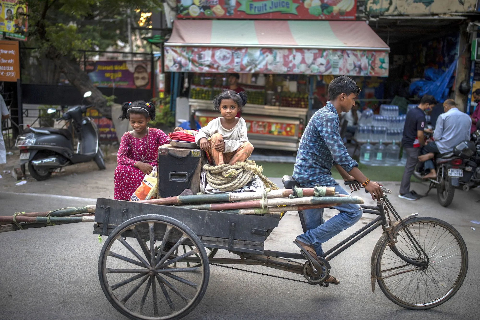 Young girls ride a cycle load carrier in New Delhi, India, Tuesday, August 17, 2021. (Photo by Altaf Qadri/AP Photo)