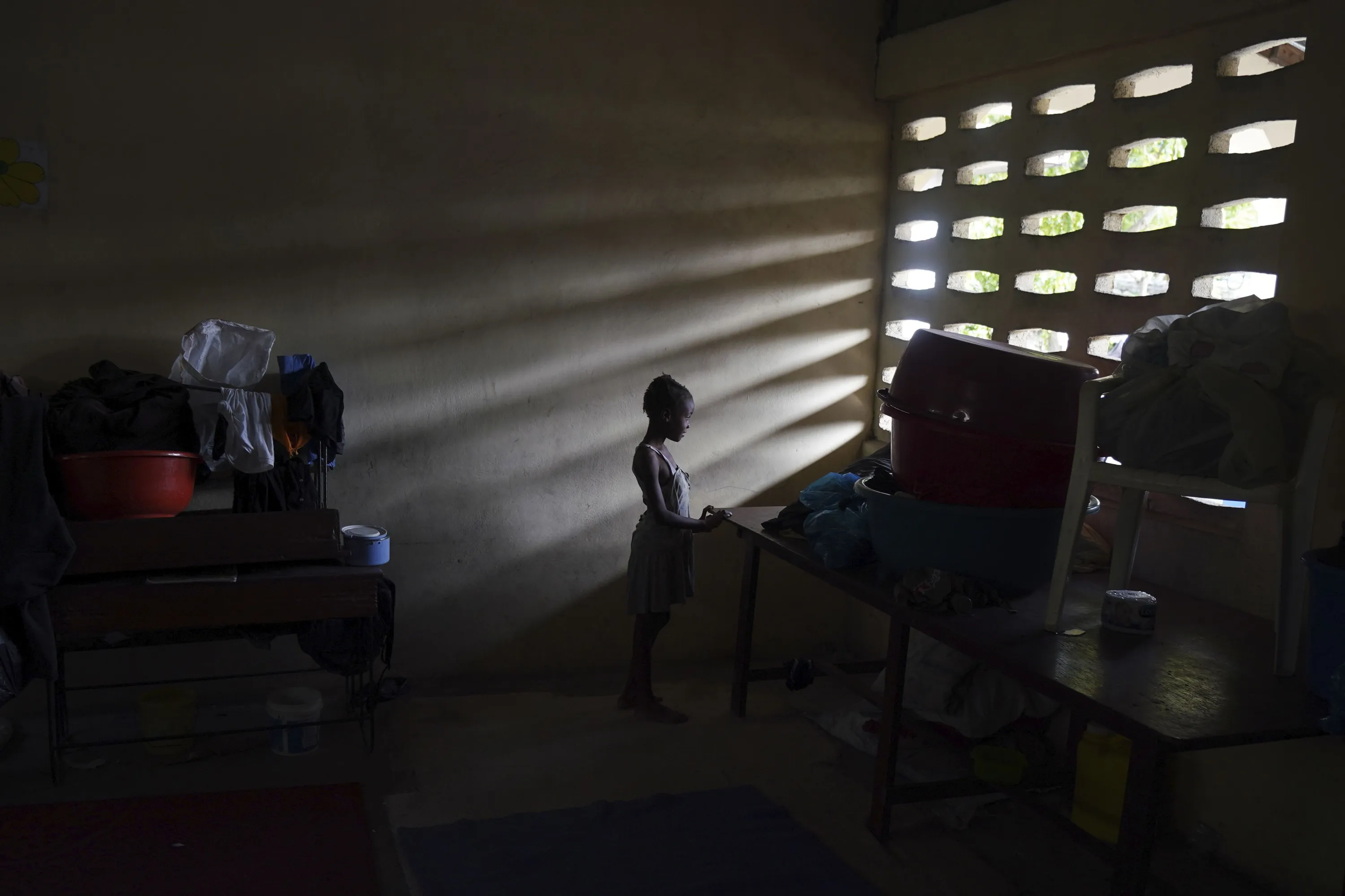A girl stands inside a classroom where her family is staying at a school turned into a shelter for those displaced by the 7.2 magnitude earthquake, in Les Cayes, Haiti, Wednesday, August 18, 2021. (Photo by Fernando Llano/AP Photo)