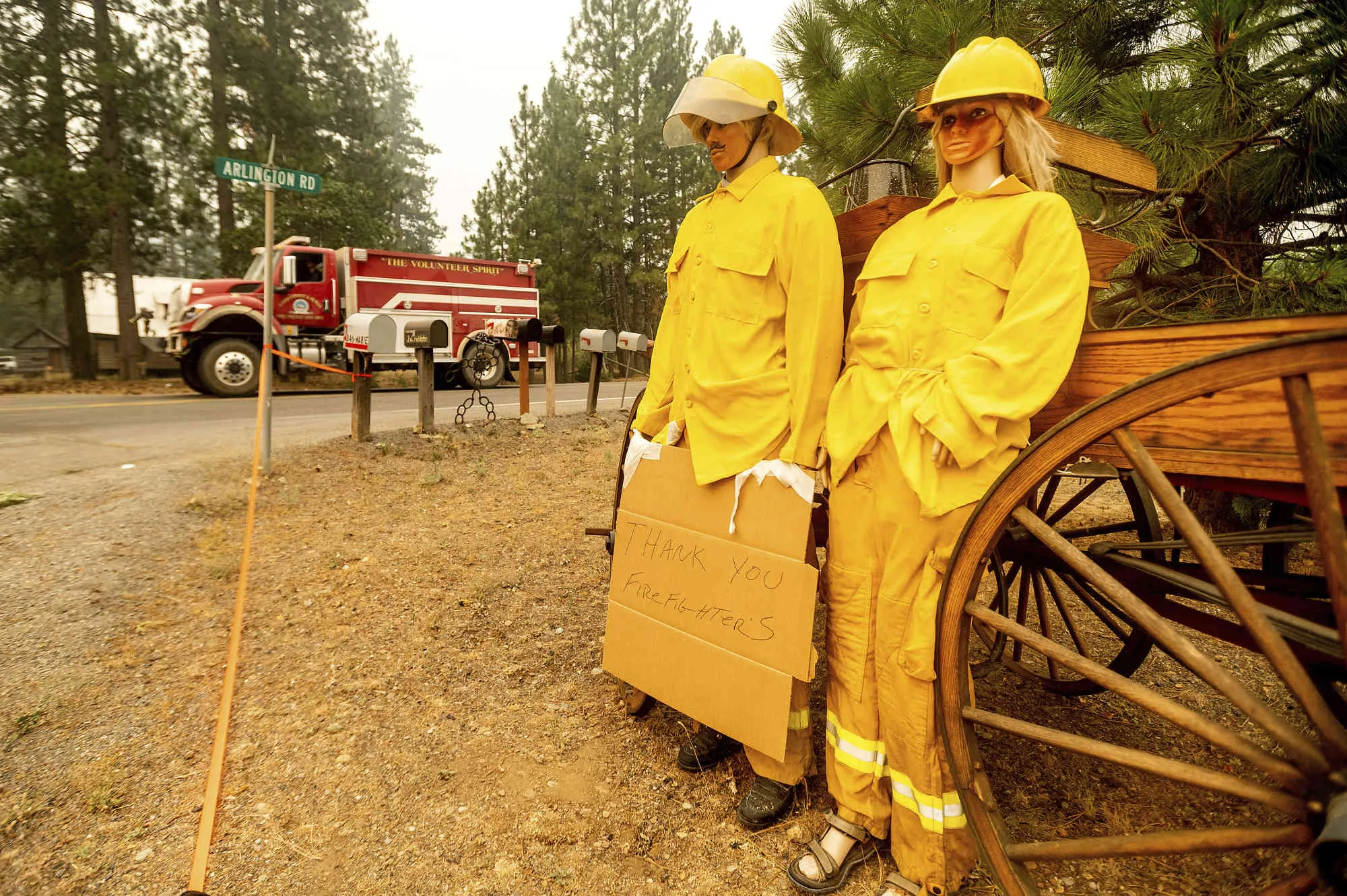 A fire truck battling the Dixie Fire passes mannequins dressed in firefighting gear in the Taylorsville community of Plumas County, Calif., on Saturday, August 14, 2021. The figures' owner said that he normally dresses the two up in tropical outfits and a fire crew dropped off firefighting apparel for them. (Photo by Noah Berger/AP Photo)