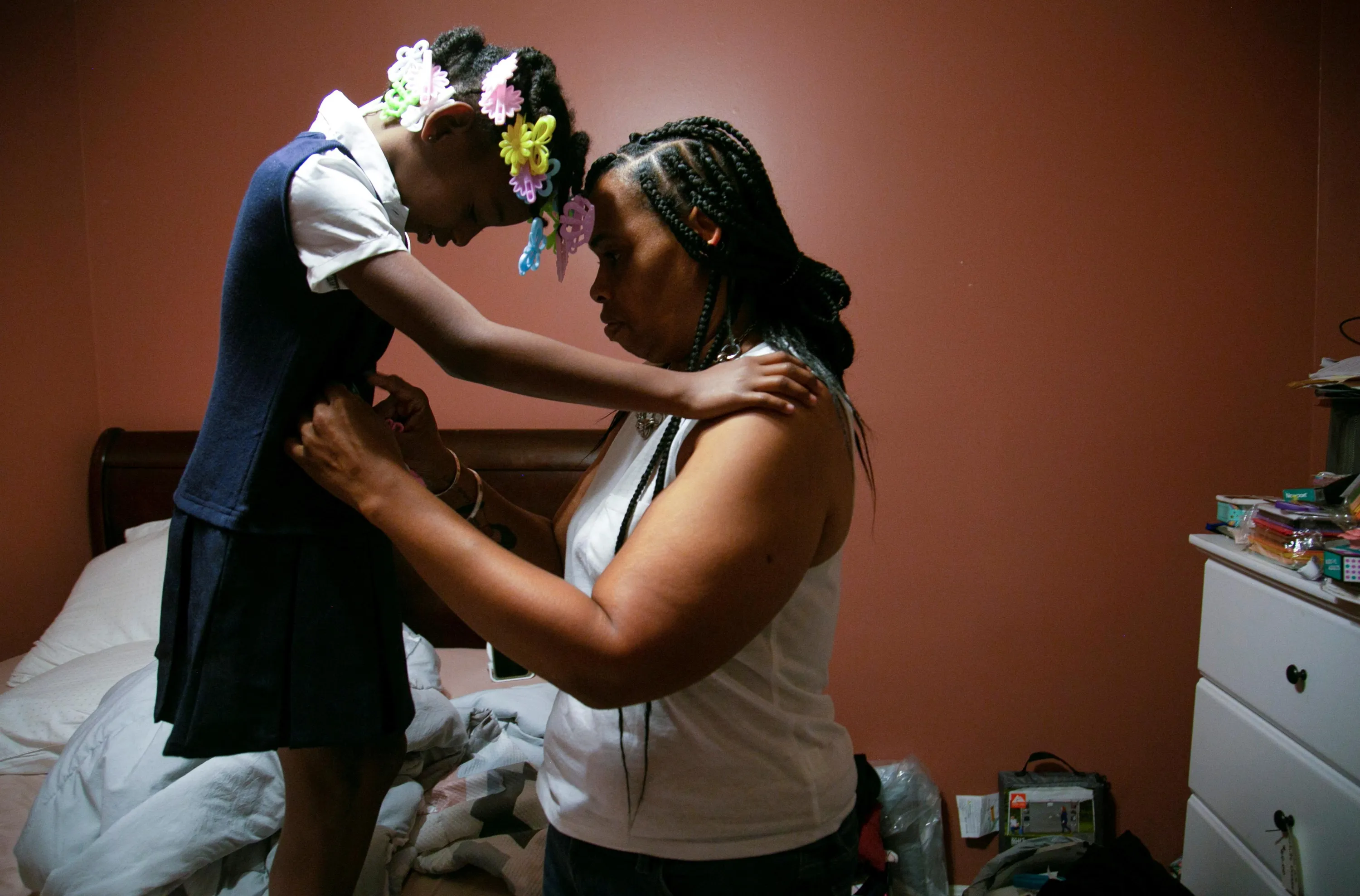 Chaunda Lee, a single mother of eight who has five children living with her and faces eviction later this week, prepares her youngest child, MiAsia Carr, for school in Louisville, Kentucky, U.S., August 16, 2021. (Photo by Amira Karaoud/Reuters)
