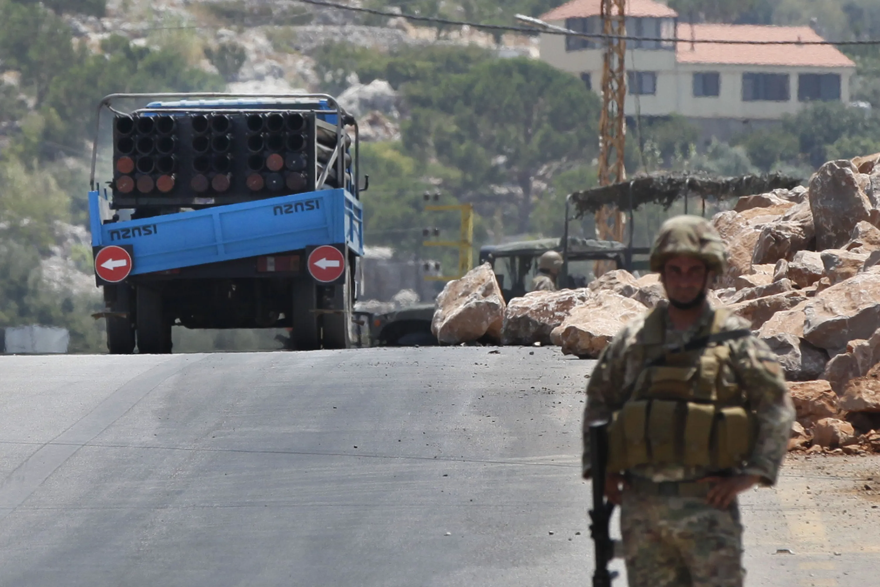 A Lebanese army soldier stands next of a rocket launcher placed on a pick up truck that was used by Hezbollah to fire rockets near Israeli positions, in the southeastern village of Shwaya, near the border with the Golan Heights, Friday, August 6, 2021. The militant Hezbollah group said it fired a barrage of rockets near Israeli positions close to the Lebanese border on Friday, calling it retaliation for Israeli airstrikes on southern Lebanon a day earlier. (Photo by Mohammed Zaatari/AP Photo)