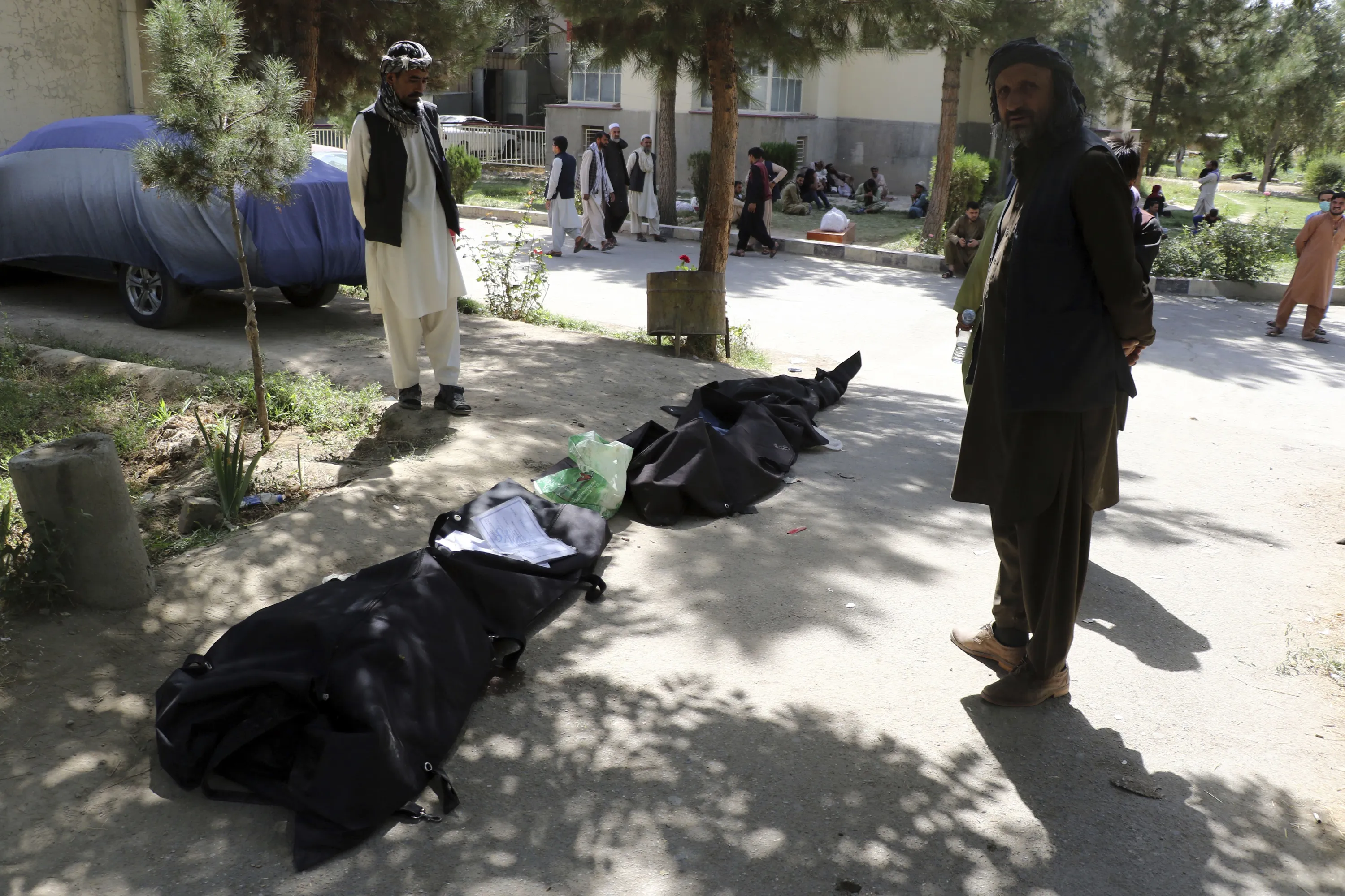 Afghan men try to identify the dead bodies at a hospital in Kabul, Afghanistan, Friday, August 27, 2021, a day after deadly attacks outside the airport. Two suicide bombers and gunmen attacked crowds of Afghans flocking to Kabul's airport Thursday, transforming a scene of desperation into one of horror in the waning days of an airlift for those fleeing the Taliban takeover. (Photo by Wali Sabawoon/AP Photo)