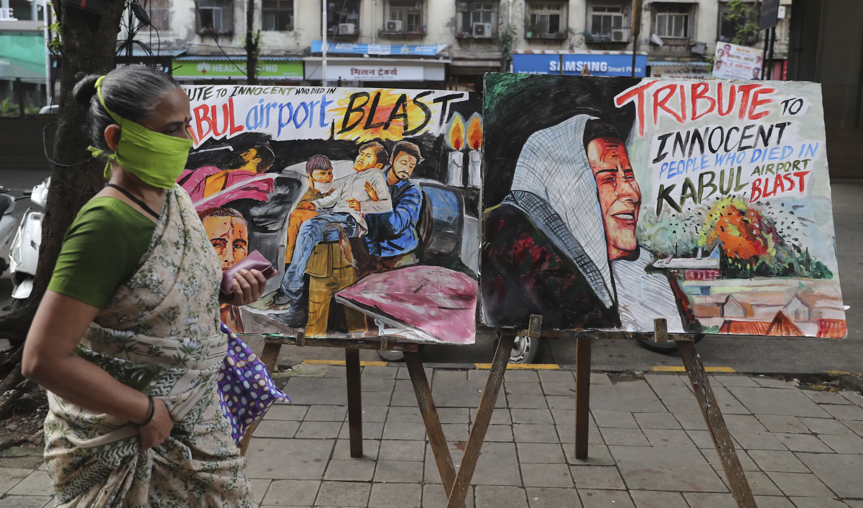 A woman walks past paintings made by artists from Gurukul art school paying tribute to victims of deadly attacks at the airport in Kabul, in Mumbai, India, Friday, August 27, 2021. Two suicide bombers and gunmen attacked crowds of Afghans flocking to Kabul's airport Thursday, transforming a scene of desperation into one of horror in the waning days of an airlift for those fleeing the Taliban takeover. (Photo by Rafiq Maqbool/AP Photo)