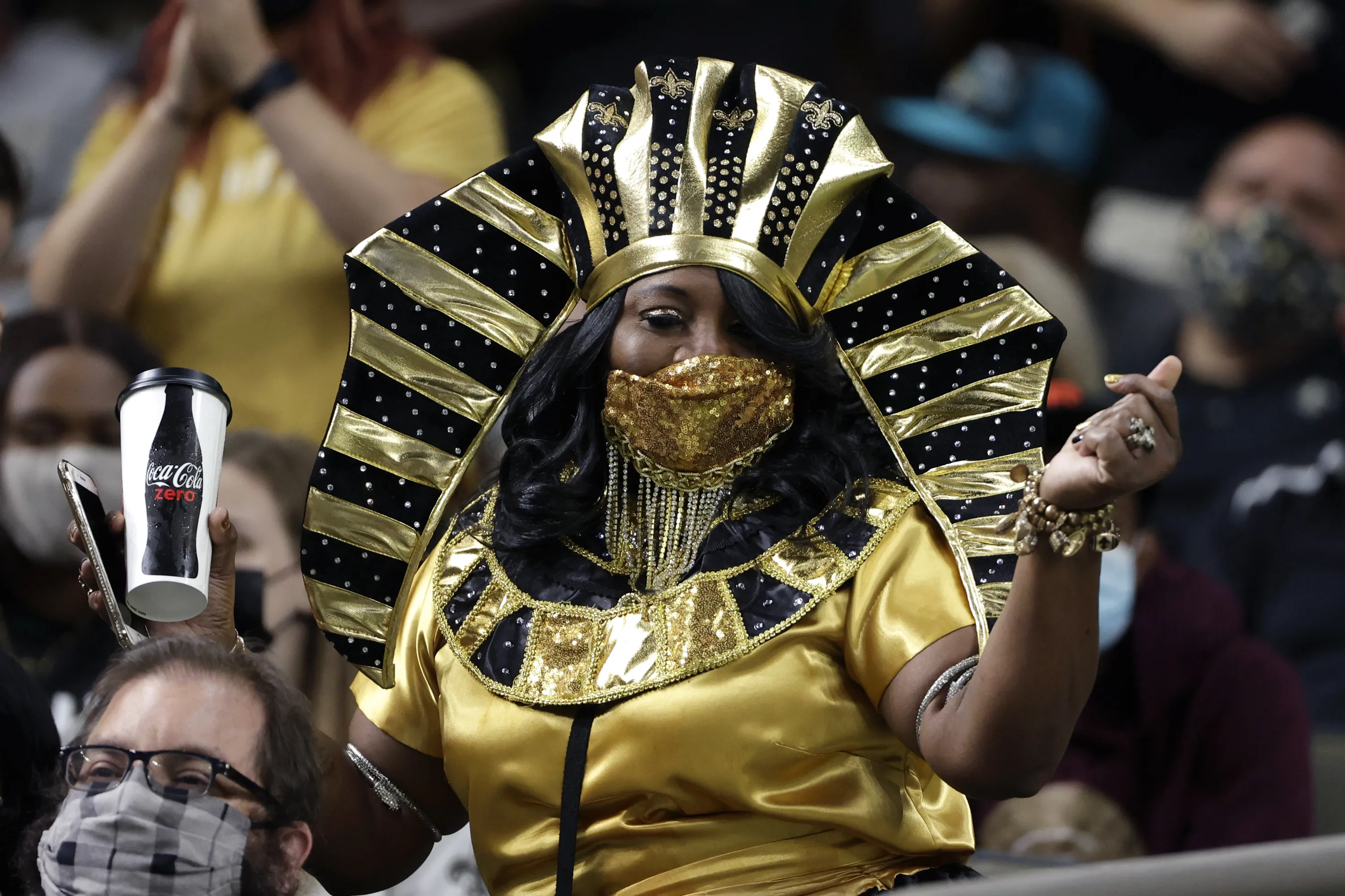 A New Orleans Saints fan parties in the stands in the first half of an NFL preseason football game against the Jacksonville Jaguars in New Orleans, Monday, August 23, 2021. Last season the team played with a marginal number of fans in a largely empty Superdome due to the coronavirus pandemic, but this year fans are allowed with proof of vaccination. (Photo by Derick Hingle/AP Photo)