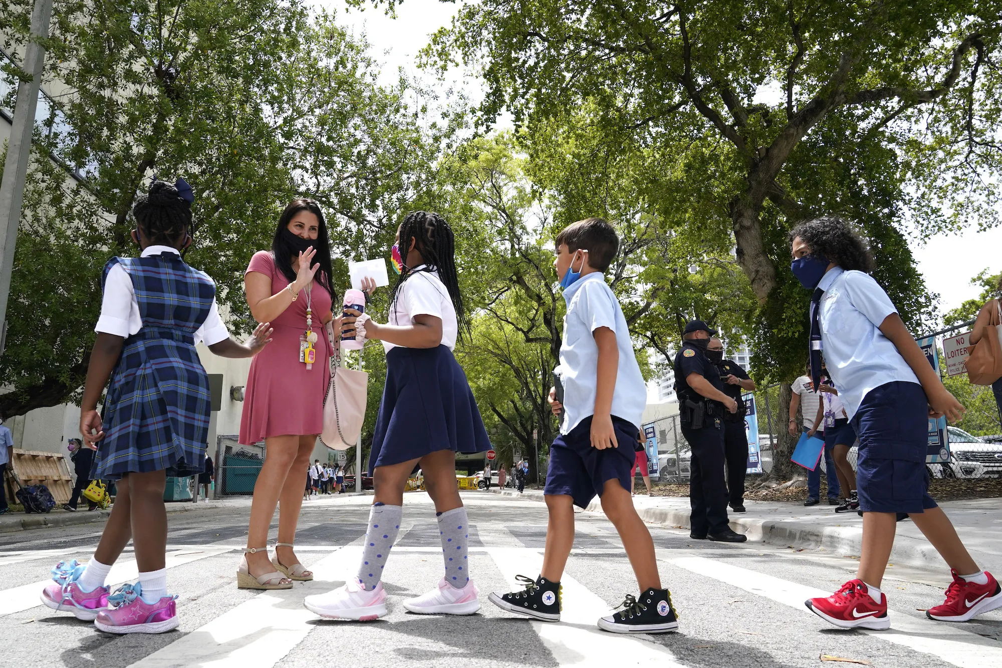 Teacher Vanessa Rosario greets students outside of iPrep Academy on the first day of school, Monday, August 23, 2021, in Miami. Schools in Miami-Dade County opened Monday with a strict mask mandate to guard against coronavirus infections. (Photo by Lynne Sladky/AP Photo)