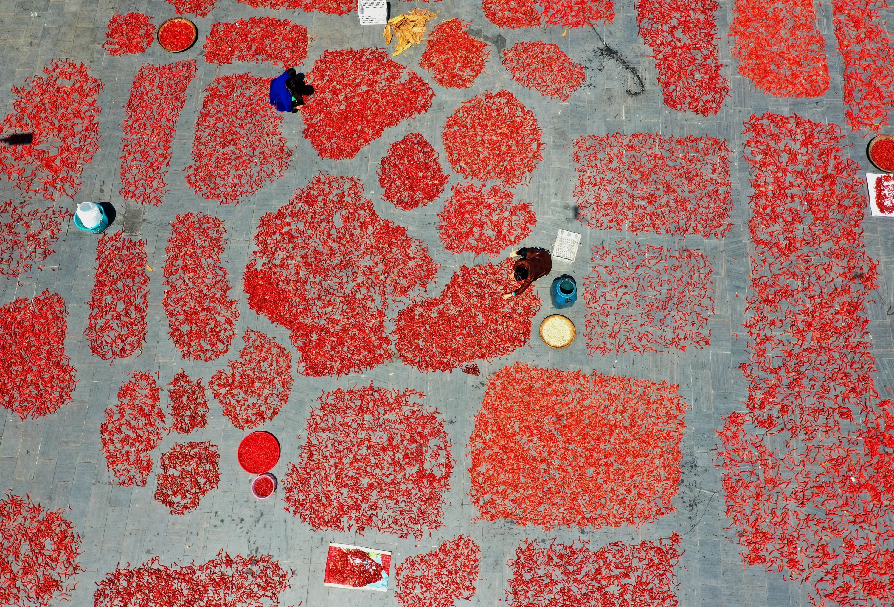 On August 22, 2021, villagers of the Dong ethnic group in Zengchong Village, Wangdong Town, Congjiang County, Guizhou Province are drying hot peppers. (Photo by SIPA Asia/Rex Features/Shutterstock)