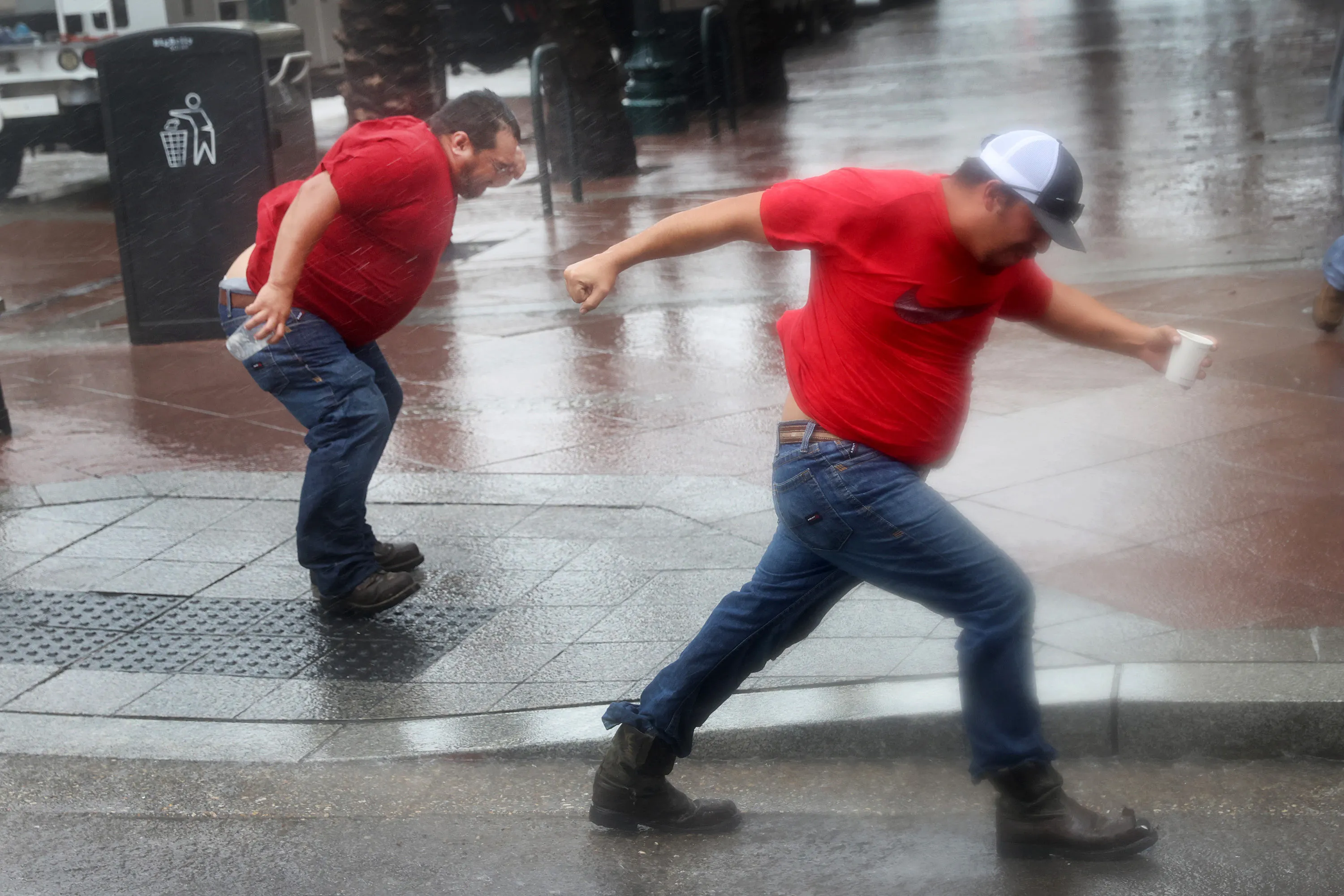 Utility workers play in the wind from Hurricane Ida as they wait for the storm to pass to begin repairs on August 29, 2021 in New Orleans, Louisiana. Ida made landfall earlier today southwest of New Orleans. (Photo by Scott Olson/Getty Images)