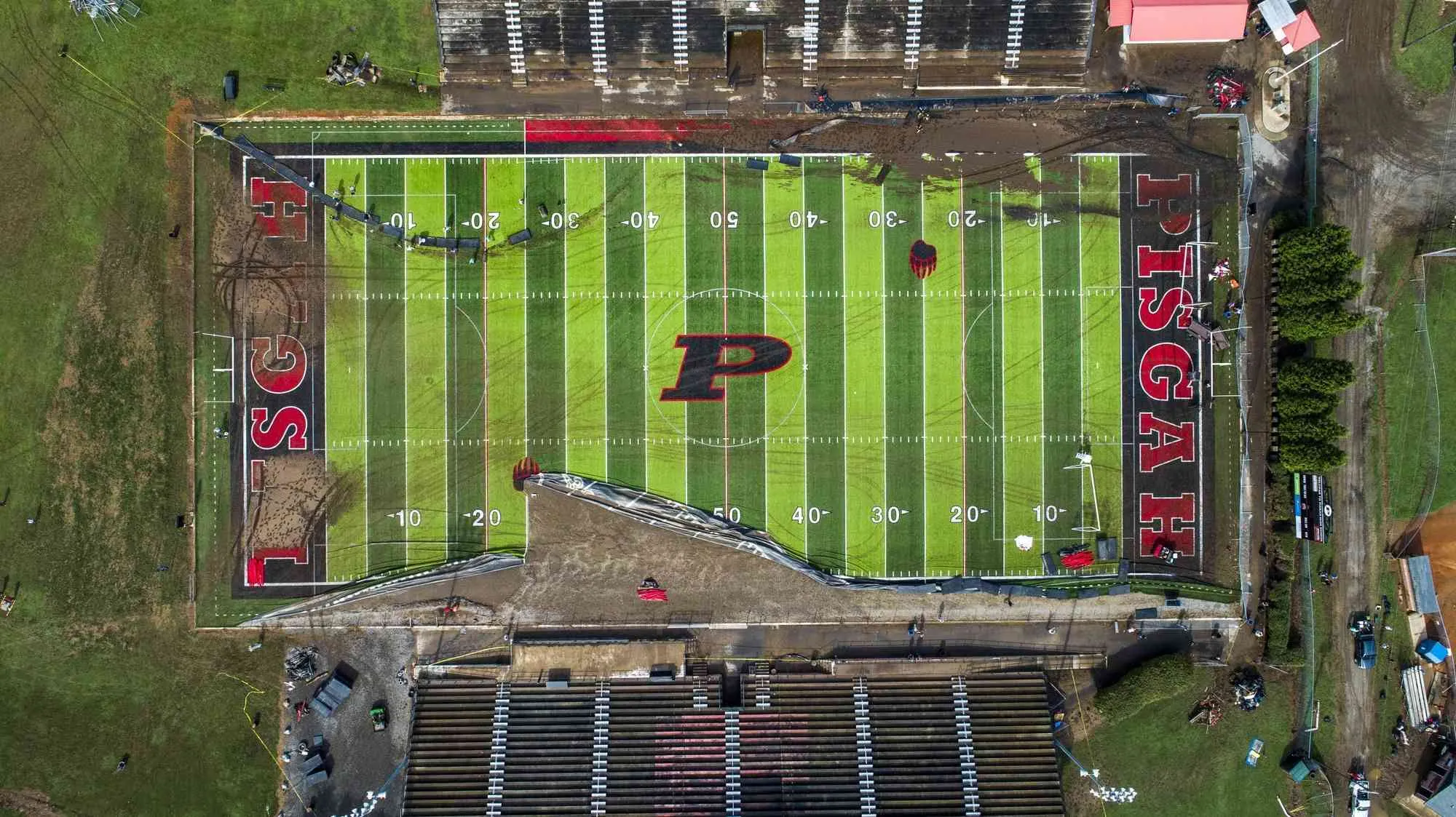 In this image taken with a drone, volunteers clear debris and try to salvage athletic equipment Thursday, August 19, 2021 at Pisgah High School in Canton, N.C., after remnants from Tropical Storm Fred caused flooding in parts of Western North Carolina Tuesday. (Photo by Travis Long/The News & Observer via AP Photo)