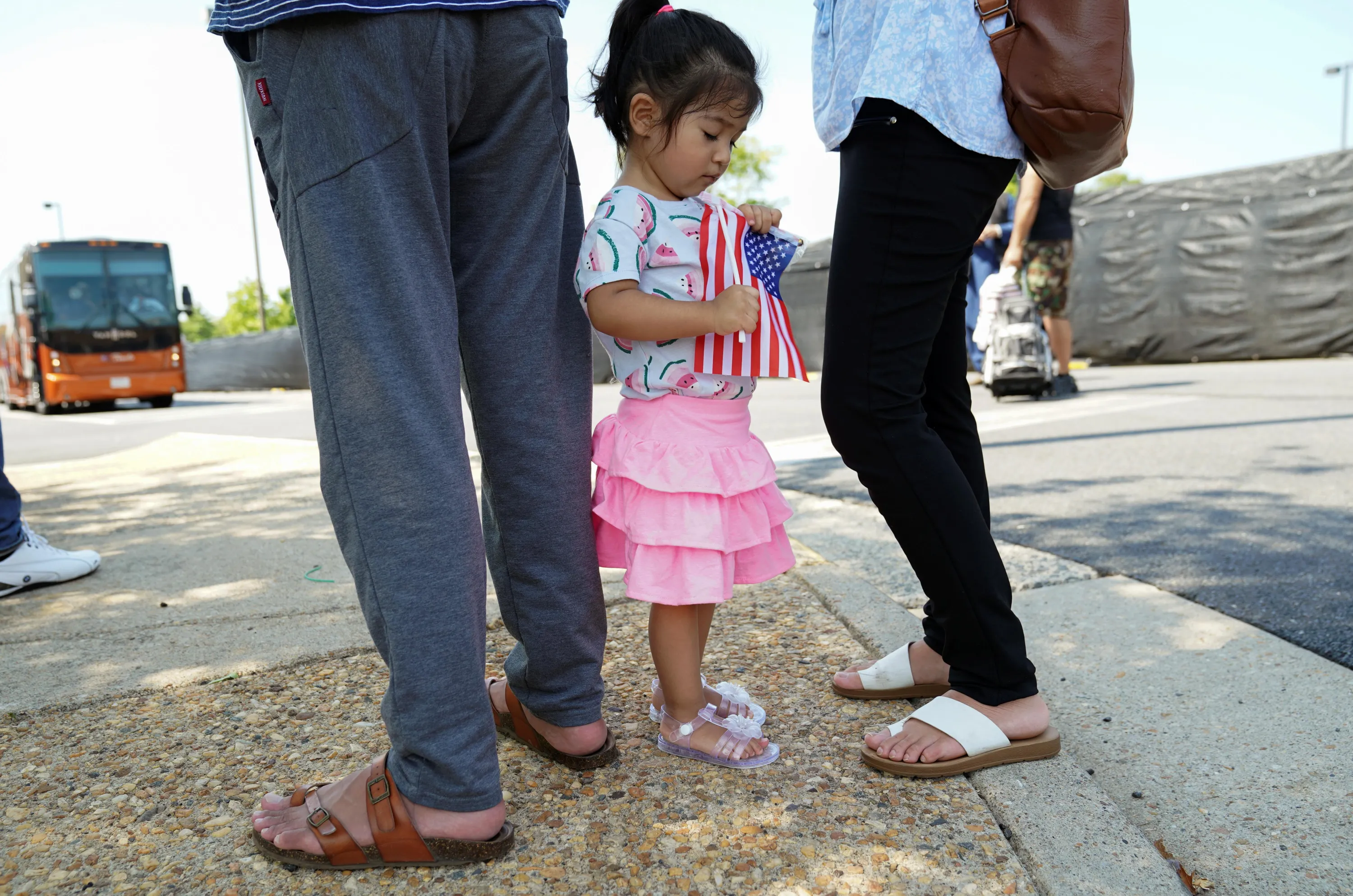 A girl holding a U.S. flag waits with her parents for Afghan relatives at a processing center for refugees evacuated from Afghanistan at the Dulles Expo Center near Dulles International Airport in Chantilly, Virginia, U.S., August 24, 2021. (Photo by Kevin Lamarque/Reuters)