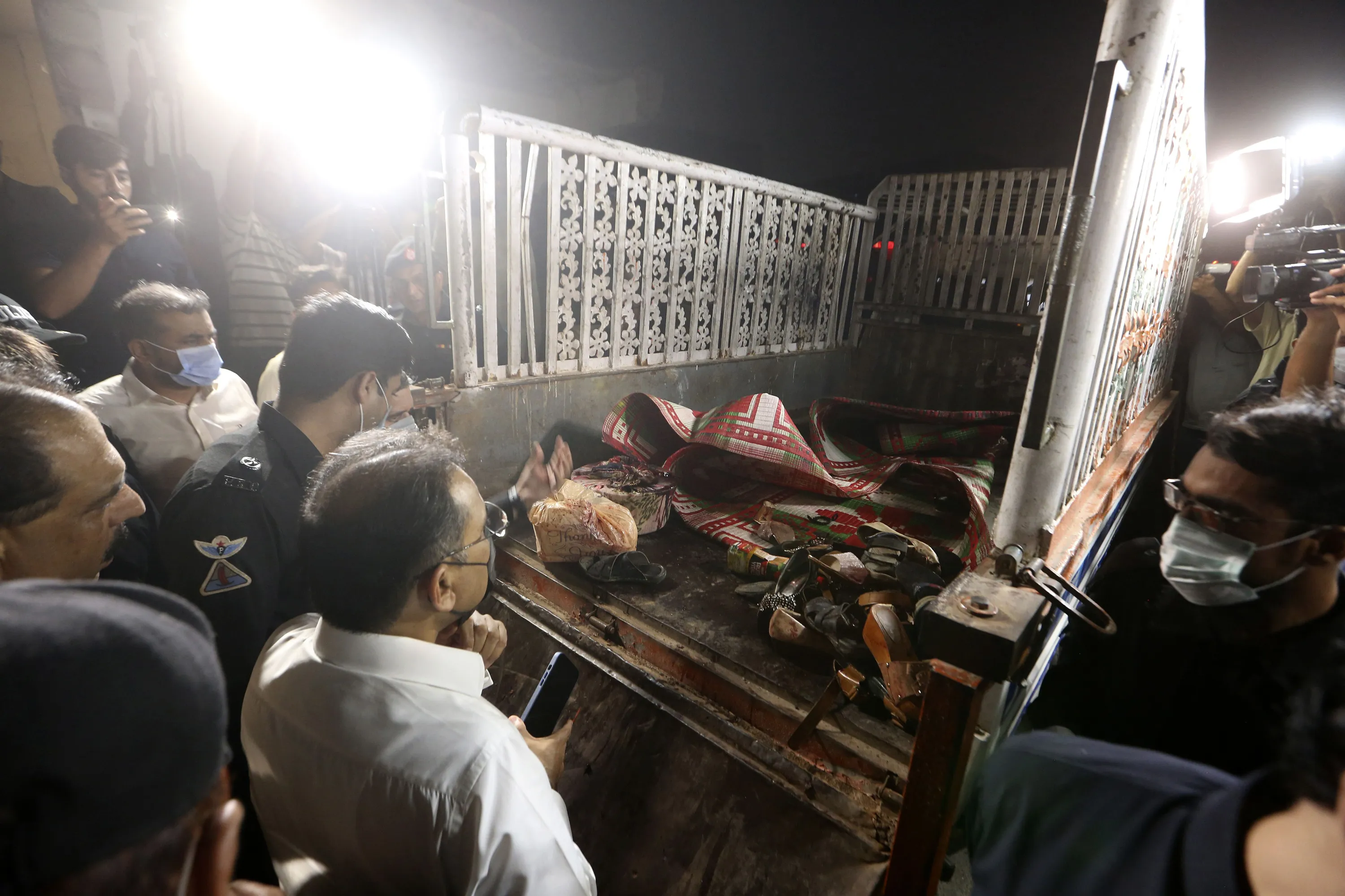 Police officials examine a truck at the site of explosion, in Karachi, Pakistan, Saturday, August 14, 2021. Attackers targeted a truck in the Pakistani port city of Karachi, killing multiple people and wounding others. An initial investigation suggests the attackers followed the truck and then threw hand grenades or some sort of improvised explosive devices at one side of the truck, police said. (Photo by Fareed Khan/AP Photo)